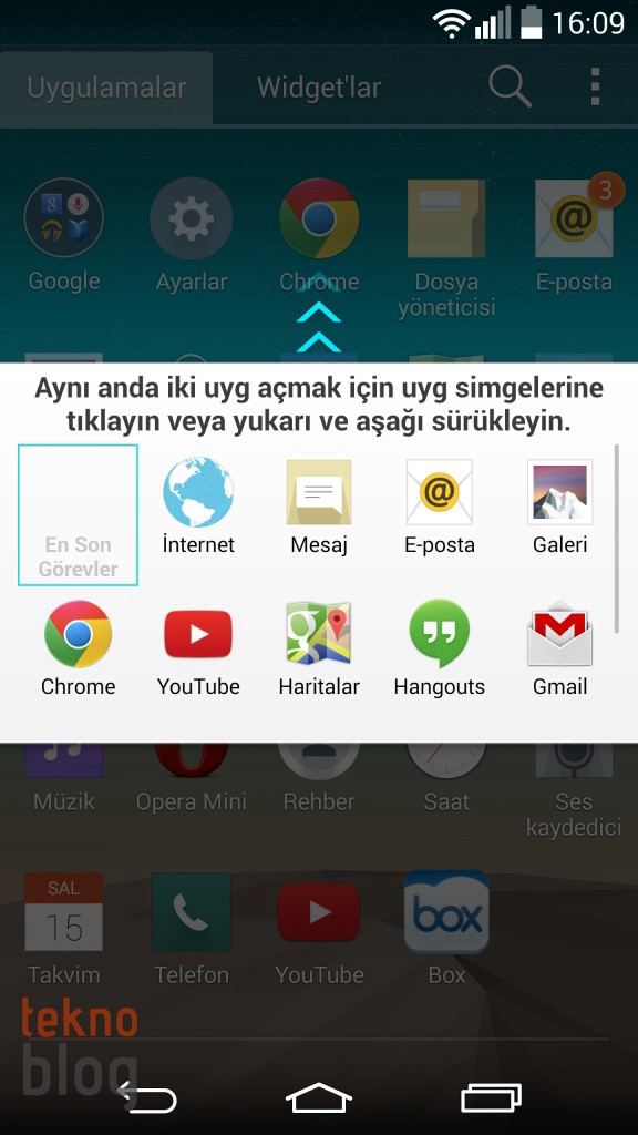 LG G3’ün büyük ekranı aynı anda iki uygulamanın ekran üzerinde kullanılmasını da elverişli kılıyor. Bunu gören LG sunduğu Çift Pencere özelliğiyle buna izin veriyor. Çoklu görev arayüzünde ekranın alt kısmında bulunan Çift Pencere düğmesine tıklattığınızda açılan panel üzerinden aynı anda birlikte kullanabileceğiniz uygulamaları seçebilirsiniz. İnternet, Mesaj, E-posta, Galeri, Chrome, YouTube, Haritalar, Hangouts, Gmail ve Dosya Yöneticisi gibi yerleşik uygulamalar Çift Pencere altında kullanılabiliyor. Ekranı paylaşan pencerelerin kaplayacağı alanı ayarlama imkanınız bulunuyor.