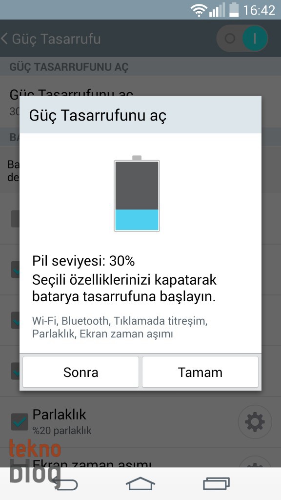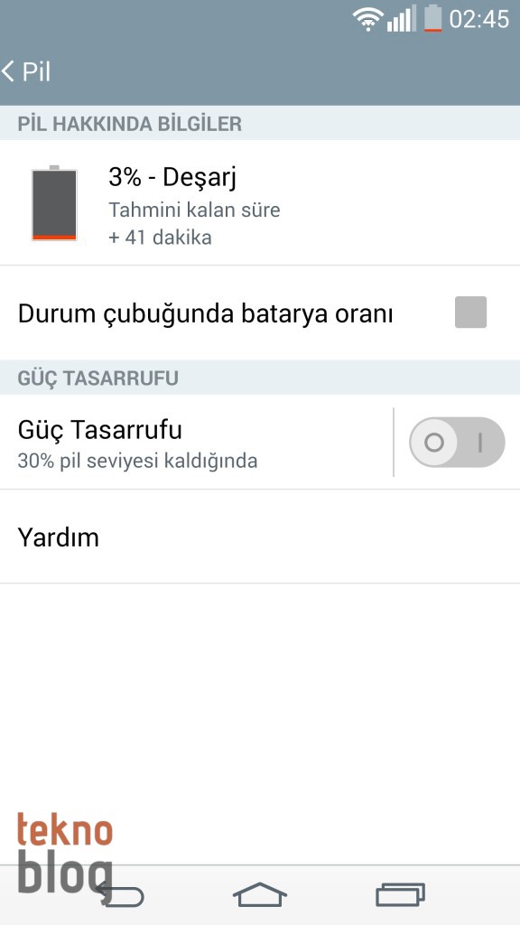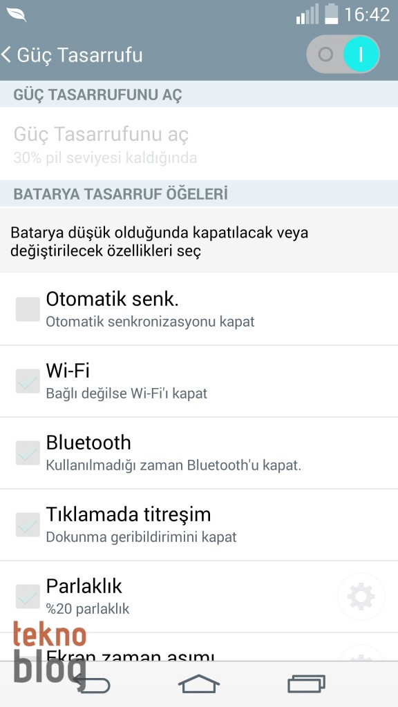 LG G3’ün pilinin en büyük tüketicilerinden biri hiç şüphesiz 5.5 inç Quad HD ekranı. Neyse ki, ekran parlaklığı çevrenin ışık koşullarına göre otomatik olarak ayarlanıyor, böylelikle ekranın güç tüketimi optimize ediliyor. Bu arada bataryanın doluluğu yüzde 30’un altına düştüğünde güç tasarruf modu etkinleştirilebiliyor. Böylelikle telefonun kalan gücünü biraz daha idareli şekilde kullanabilirsiniz.