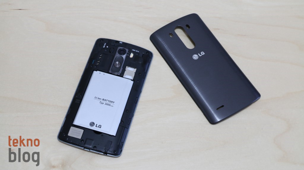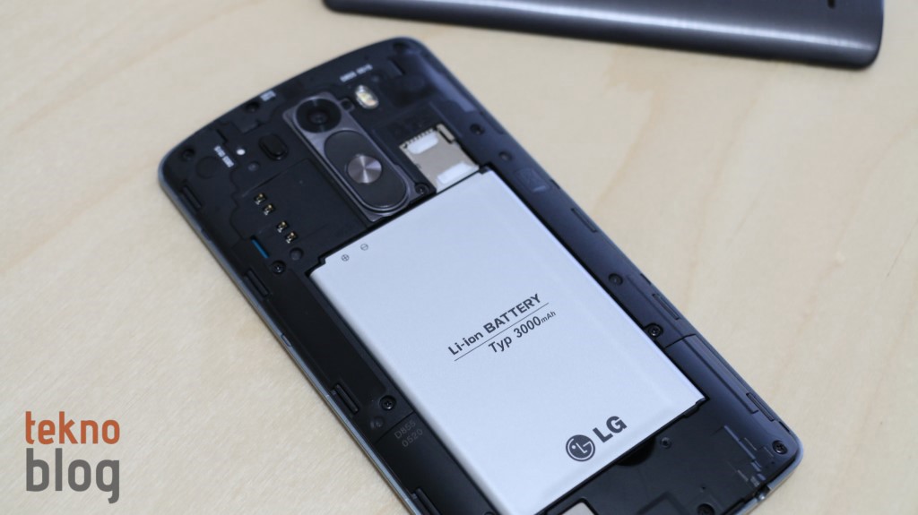 LG G3’ün kapağı çıkarılabiliyor. Sağ kenarda aşağı doğru yerleştirilmiş küçük çentik yardımıyla plastik arka kapak rahatlıkla çıkarılıyor. Kapağı çıkardığımızda değiştirilebilir batarya dikkatimizi çeken ilk ayrıntı oluyor. microSD ve microSIM kart yuvaları pil yatağının hemen üstüne konumlandırılmış. Bu durum bellek veya SIM kartı değişimi için cihazı kapatmamız gerektiği anlamına geliyor.