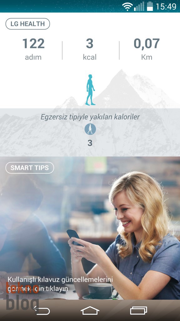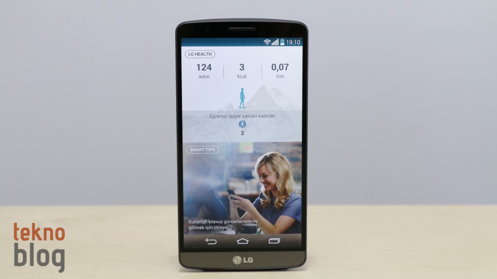 5.5 inç ekran ve Quad HD çözünürlük, ana ekranda bulunan her bir panele daha fazla kısayol veya widget yerleştirebileceğiniz anlamına geliyor. LG G3 başlangıçta üç temel panelle geliyor. En solda yer alan ve sabit duran panel “G” olarak adlandırılmış. Burada LG Health ve Smart Tips uygulamalarının bileşenleri yer alıyor. Samsung Galaxy S5, HTC One (M8) gibi LG G3’te de var olan çeşitli sensörler yardımıyla vücut durumu sürekli kontrol ediliyor; atılan adım sayısı, gidilen mesafe, yakılan kalori miktarı sürekli takip ediliyor. Böylelikle günlük egzersiz hedefinize ulaşıp ulaşmadığınızı sürekli yanınızda taşıdığınız LG G3 ile takip etmeniz mümkün oluyor.