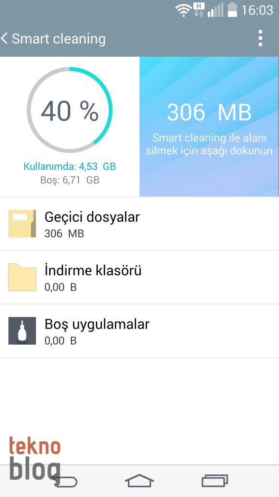 Depolamadan bahsetmişken, LG G3’te yer alan Smart Cleaning özelliği telefonun belleğinde yer tutan bazı uygulama ve geçici dosyaları silme fırsatı sunuyor. Böylelikle yerden tasarruf etme imkanınız oluyor. Ayarlar altında, Genel sekmesi içinden ulaşılan Smart Cleaning telefonun mevcut hafızasının ne kadar dolu olduğunu, geçici dosyalar ve indirme klasörünün büyüklüklerini de gösteriyor. Tek bir tıklatmayla silinmesi gereken dosyalar da silinebiliyor.