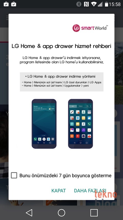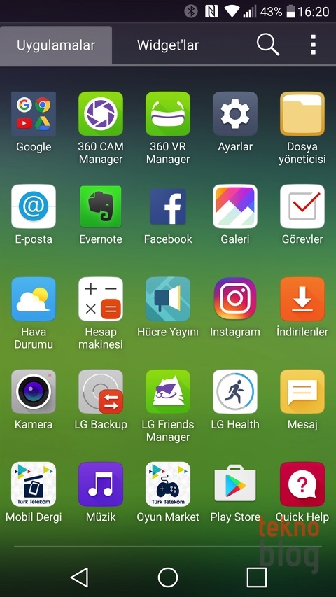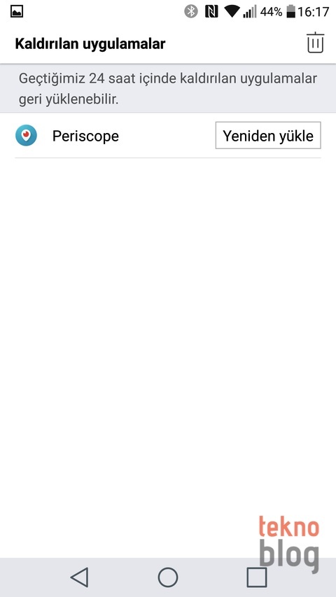 LG’nin Müzik, QuickRemote, Ses kaydedici, Dosya yöneticisi, Hava Durumu gibi yüklü olarak sunduğu çeşitli uygulamalar var. Ayrıca Google’ın Gmail, YouTube, Haritalar gibi uygulamalarını da yüklü olarak görüyoruz. Önerilen uygulamalar başlıklı bir klasör altında da Facebook, Instagram ve Evernote uygulamaları ön yüklü olarak geliyor. Daha fazla uygulama ve oyunu Google Play Store’dan indirebileceğiniz gibi, LG SmartWorld adı verilen uygulama da yüklenebilecek uygulamalar, oyunlar konusunda alternatif olarak hizmet veriyor. Bu arada SmartWorld’de farklı tema, duvar kağıdı ve diğer özelleştirme seçeneklerini de bulabilirsiniz. LG G5’in yeni kullanıcı arayüzünün önemli yeniliklerinden bir tanesi de Kaldırılan uygulamalar bölümü. Ana ekrandan da kolay erişim sağlanan bu bölümde son 24 saat içinde telefondan kaldırılan uygulamalar gösteriliyor, bunların kolaylıkla G5’e geri yüklenmesine imkan sağlanıyor. Bu arada LG G5’in ilk kurulumunu Türk Telekom SIM kartı takılı şekilde gerçekleştirdik ve telefon kullanıma hazır hâle gelmeden önce Türk Telekom’un Müzik, Online İşlem, Tivibu Spor, Mobil Dergi gibi uygulamaları da otomatik olarak yüklendi.