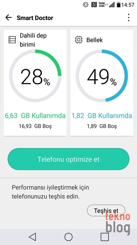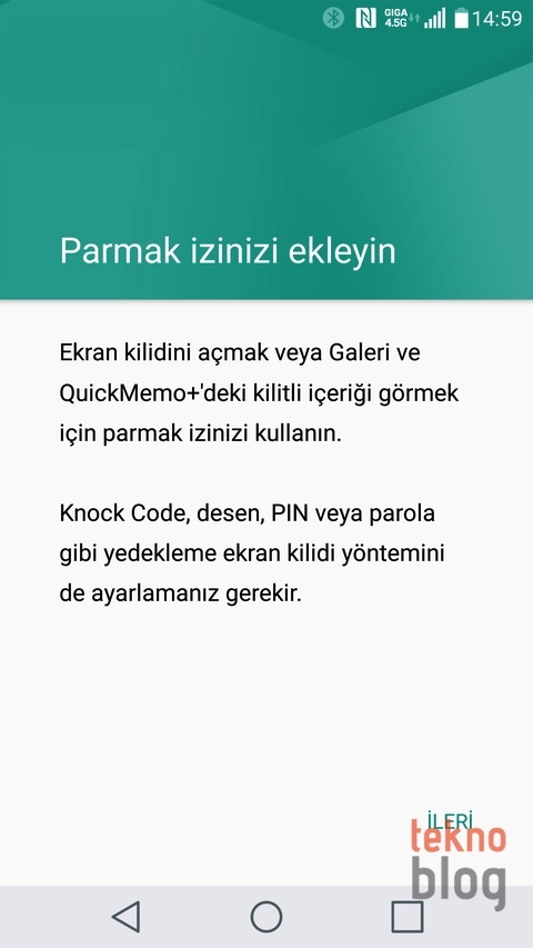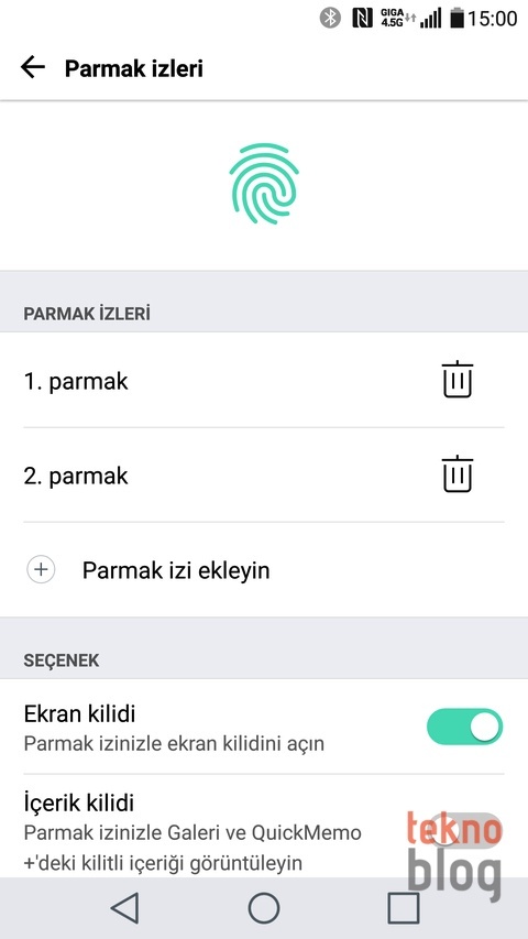 Parmak izi okuyucusuna sağ ve sol el işaret parmaklarını tanıtmak yeterli oluyor. Parmak izi tanıma işlemi diğer telefonlardakine göre daha kısa sürede gerçekleşiyor. Parmak izi okuması hızlı şekilde yapılıyor, ancak bazen ekran kilidini açmak için bizzat parmak ucunu okuyucuya temas ettirmek zorunda kaldık. Parmak izi okuyucusu, telefonun masa gibi bir yüzey üzerinde durduğu durumlarda işlevini yitiriyor. Yemek yerken veya telefonu elinize alamayacağınız başka bir durumda parmak izi okuyucusu yerine LG’nin Knock On olarak adlandırdığı, ekrana çift tıklatarak ekranı uyandırma veya Knock Code olarak adlandırılan, ekran kilidini belirli bir tıklatma dizisiyle açma imkanı sunan özelliklerinden yararlanmak gerekiyor.