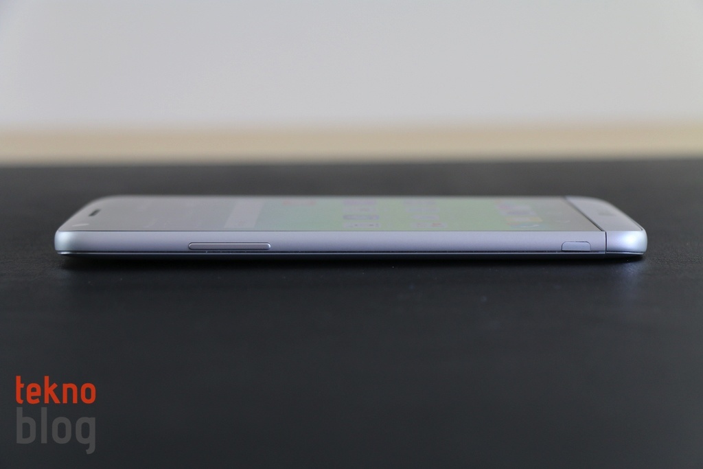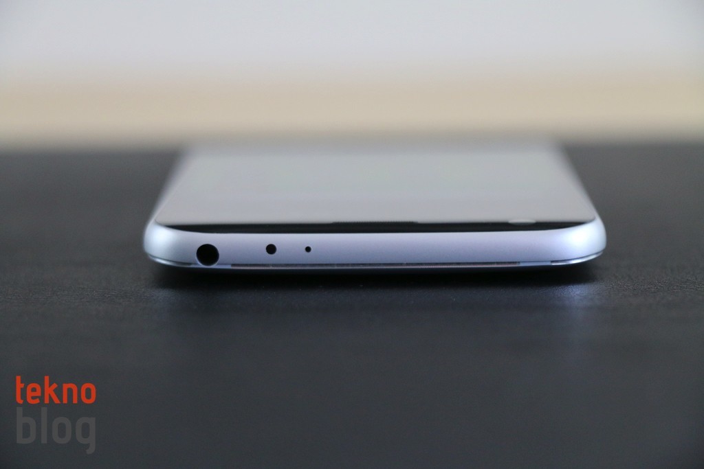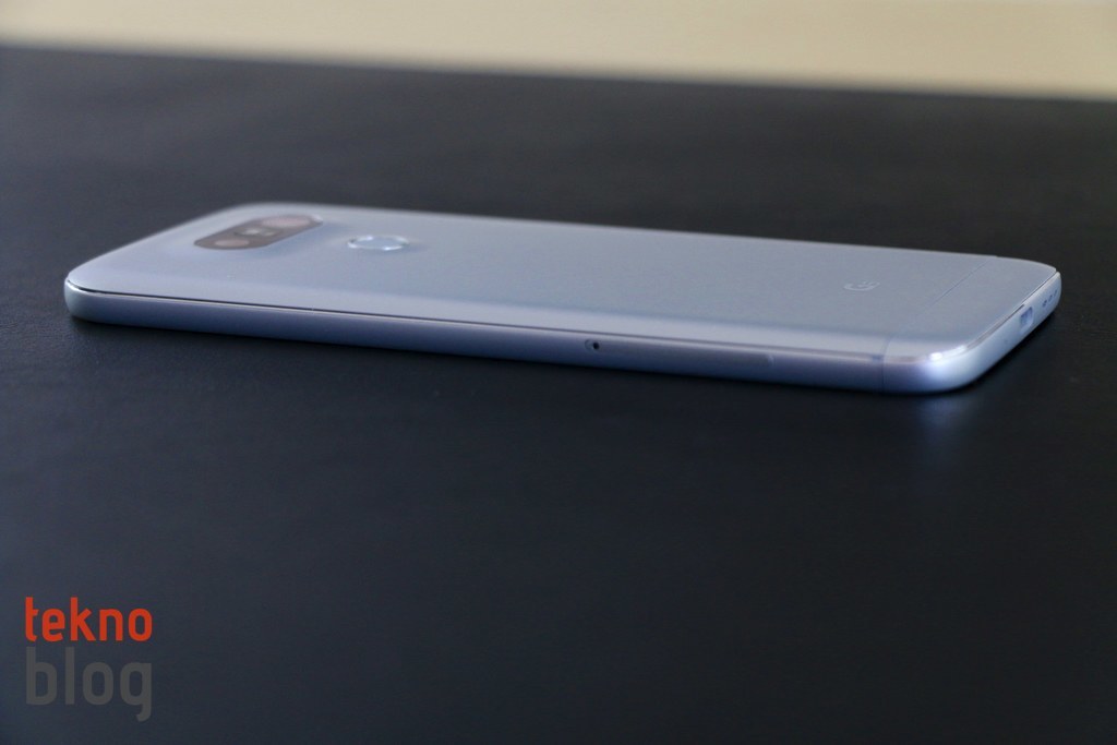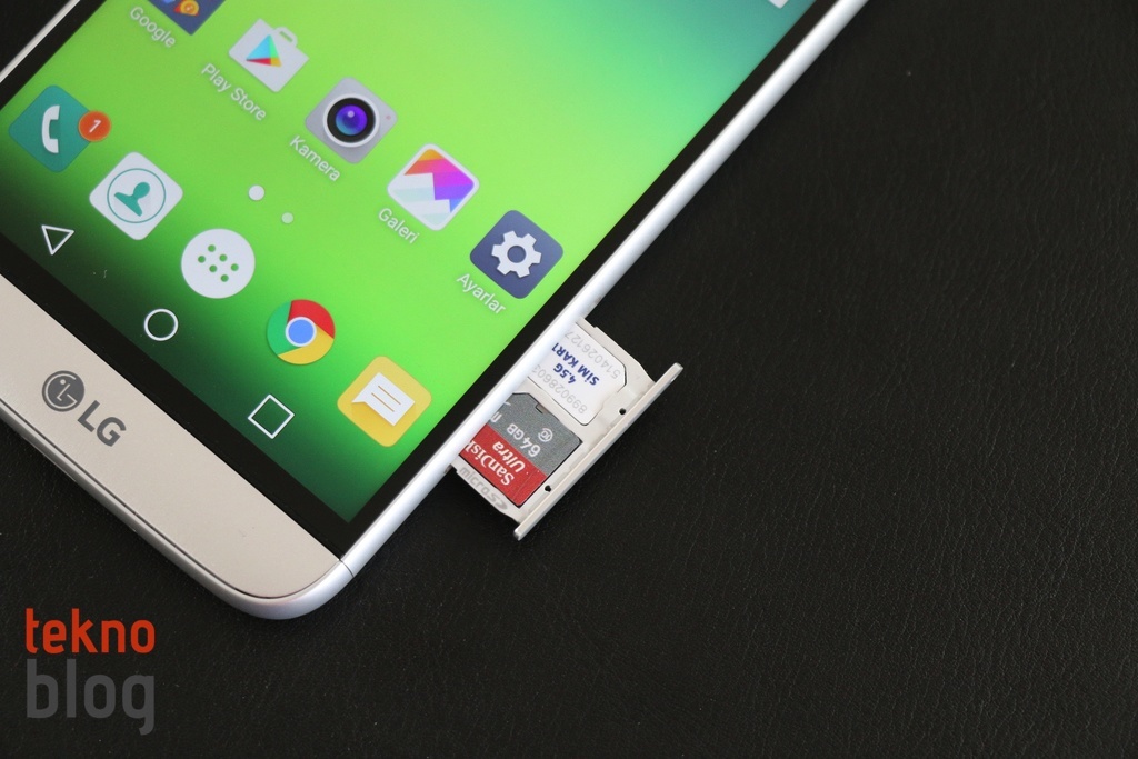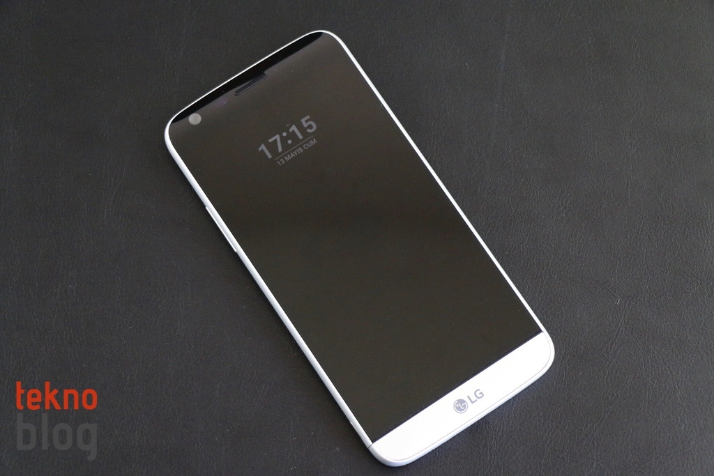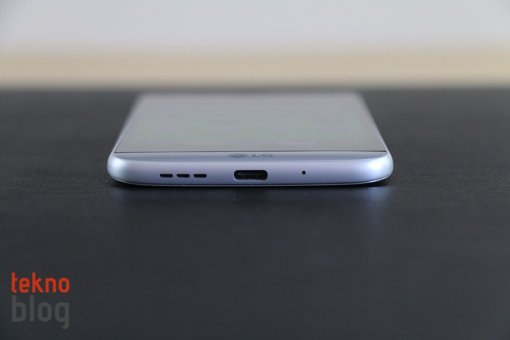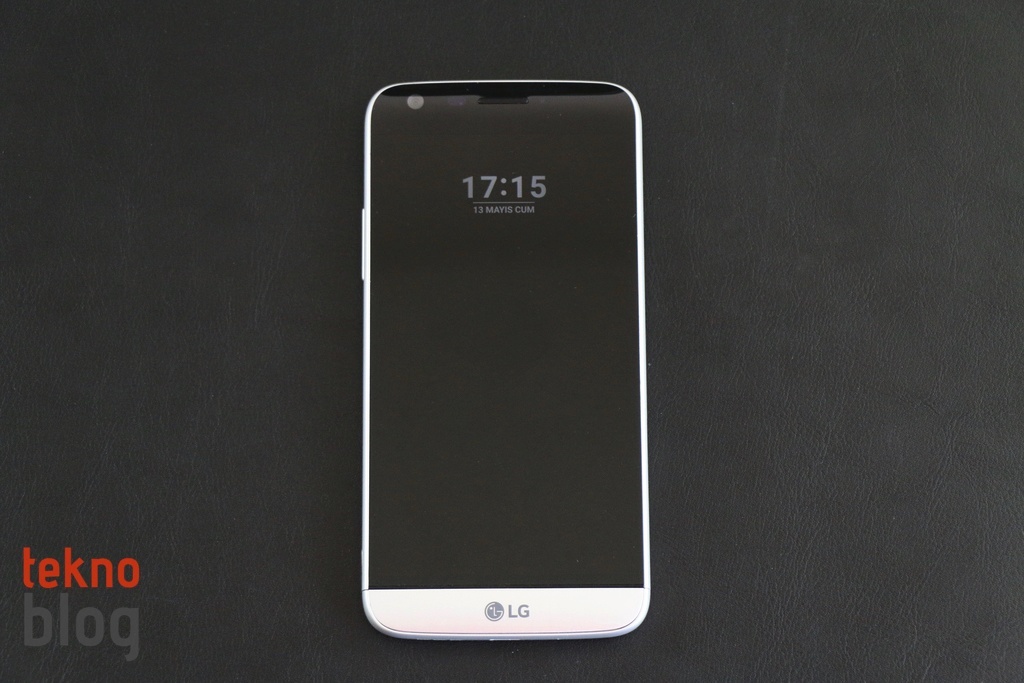 Ekranın altında herhangi bir tuş yok, sadece LG logosunu görüyoruz ki, zaten bu logo da modüler bileşenin üstünde bulunuyor. Gorilla Glass 4 camın uzandığı ve kavis yaptığı ekranın üstündeki kısımda ise ahize hoparlörü, LED bildirim ışığı ve 8 megapiksel kamera yer alıyor. Telefonun üst tarafında 3.5 mm. kulaklık jakı, kızılötesi port, ikinci mikrofon yer alıyor. Alt kenarda ise ana mikrofon, USB-C portu, hoparlör bulunuyor. Geçen yılın amiral gemisi LG telefonlarında ve onu takip eden alt segment telefonlarda arkada, güç butonunun altına ve üstüne yerleştirilmiş ses tuşlarının, LG G5’te sol kenara alındığını görüyoruz. microSD ve nanoSIM kart tepsisi ise telefonun sağ kenarında yer alıyor ve bu tepsi kutudan çıkan sivri uçlu cisim yardımıyla yerinden çıkarılıyor.