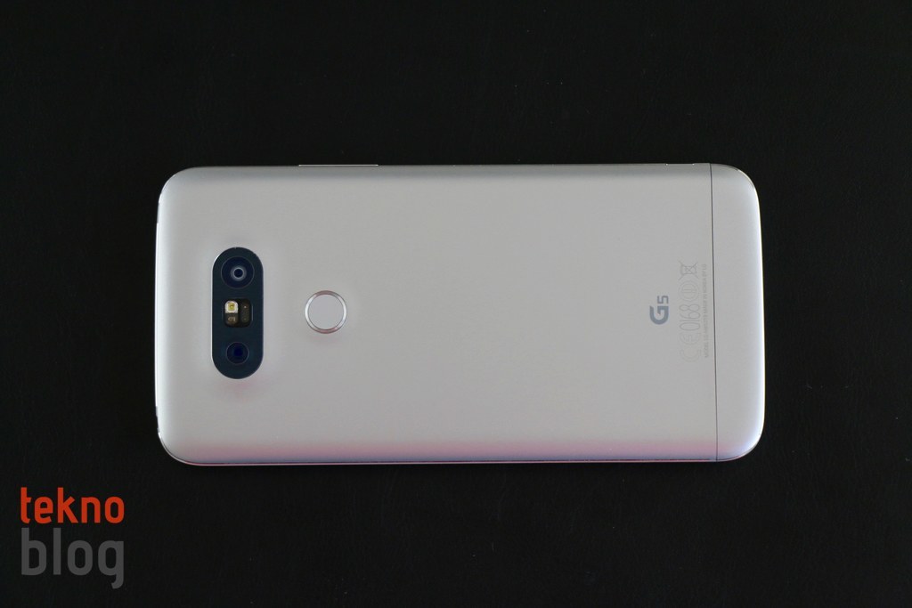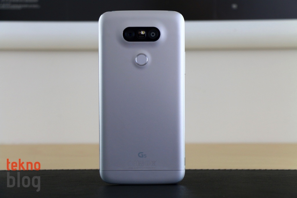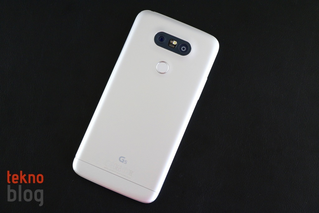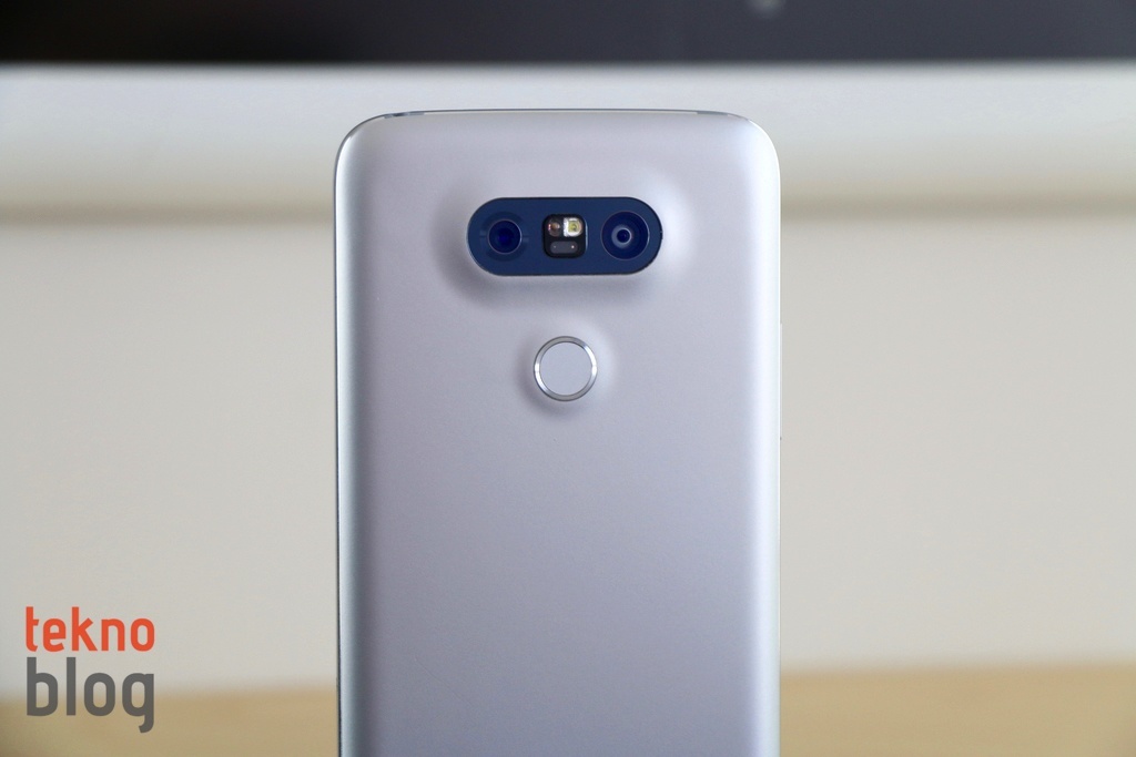 Arka tarafta gördüğümüz değişiklikler sadece metal yüzeyle sınırlı kalmıyor. Dikkat çeken ilk ayrıntı iki kameralı yapı oluyor. G5’in arkasında biri 16 megapiksel, diğeri 8 megapiksel çözünürlüklü iki kamera yer alıyor. Bunların ortasında çift renkli LED flaş ve lazer otomatik odak sistemi yer alıyor. Bu yapının telefonun arkasında hafif bir çıkıntı yaptığını da belirtmeden geçmeyelim. Kamera sistemin altında ise yuvarlak bir tuş görüyoruz. Bu, LG G5’in güç butonu, aynı zamanda da parmak izi okuyucusu barındırıyor. Apple, Samsung, HTC gibi üreticiler parmak izi tarayıcısına ekranın altında yer vermeyi tercih ederlerken, LG arkaya yerleştirilmiş parmak izi okuyucusunun daha çok işe yarayacağını düşünmüş.