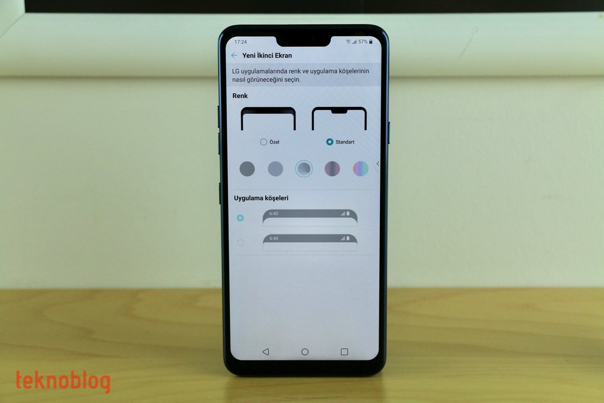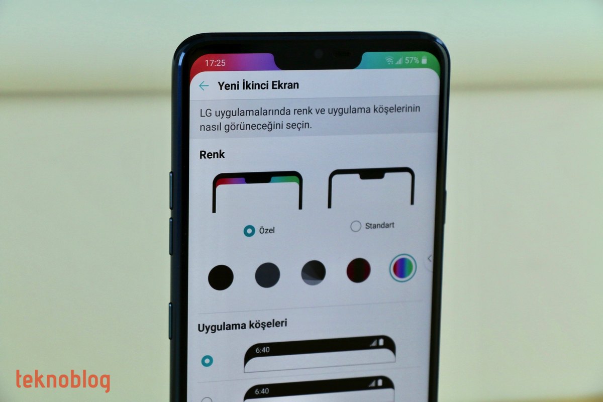 Öte yandan LG, çentiğin etrafındaki çubuğu karartmak yerine arka planını değiştirme imkanını sunuyor. Böylelikle genel kullanıcı arayüzünden daha farklı görünen ve LG’nin “İkinci” ekran yaklaşımına daha uygun bir görünüm elde ediliyor. Bu arada “İkinci ekran”lı formda kullanım sırasında ana ekranın köşelerinin kavis oranını da seçme imkanınız bulunuyor. Bize sorarsanız en güzeli, çentiği nasıl geldiyse o şekilde bırakmanız, kutudan açıp kullanmaya başladığınız andaki görünümü değiştirmemeniz olacaktır.