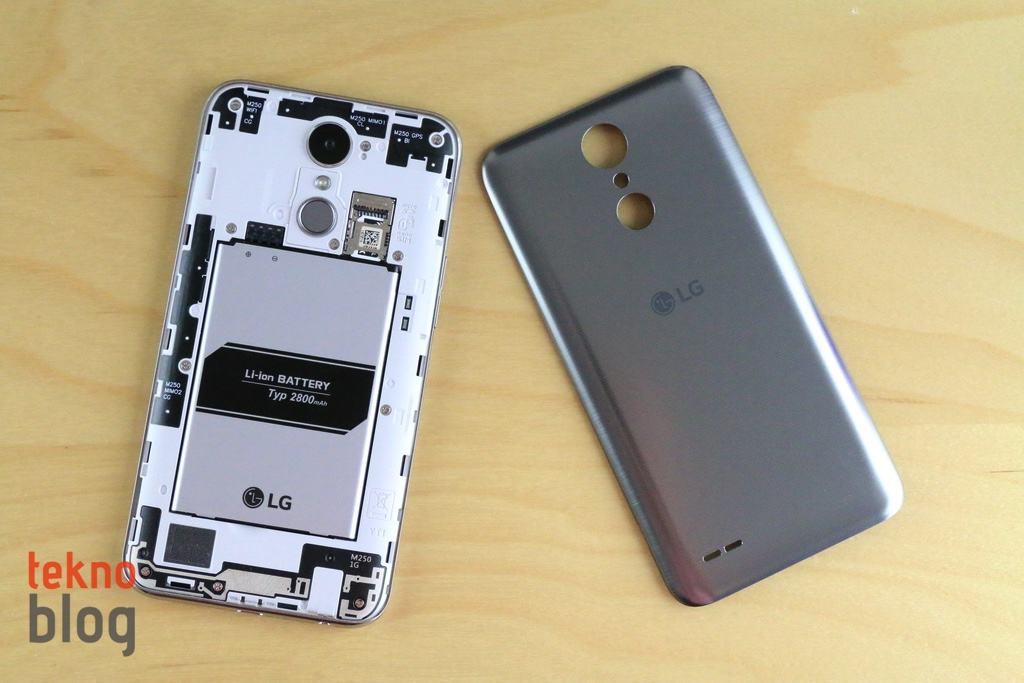 LG K10 2017’nin arka kapağı, sağ kenarın alt kısmındaki girintinin yardımıyla yerinden çıkarılabiliyor. Arka kapak açıldığında kullanıcıları 2800 mAh kapasiteli pil karşılıyor. Bu pil yerinden çıkarılabiliyor. Pil çıkarıldıktan sonra telefona nano SIM kart ve micro SD kart takılabiliyor.