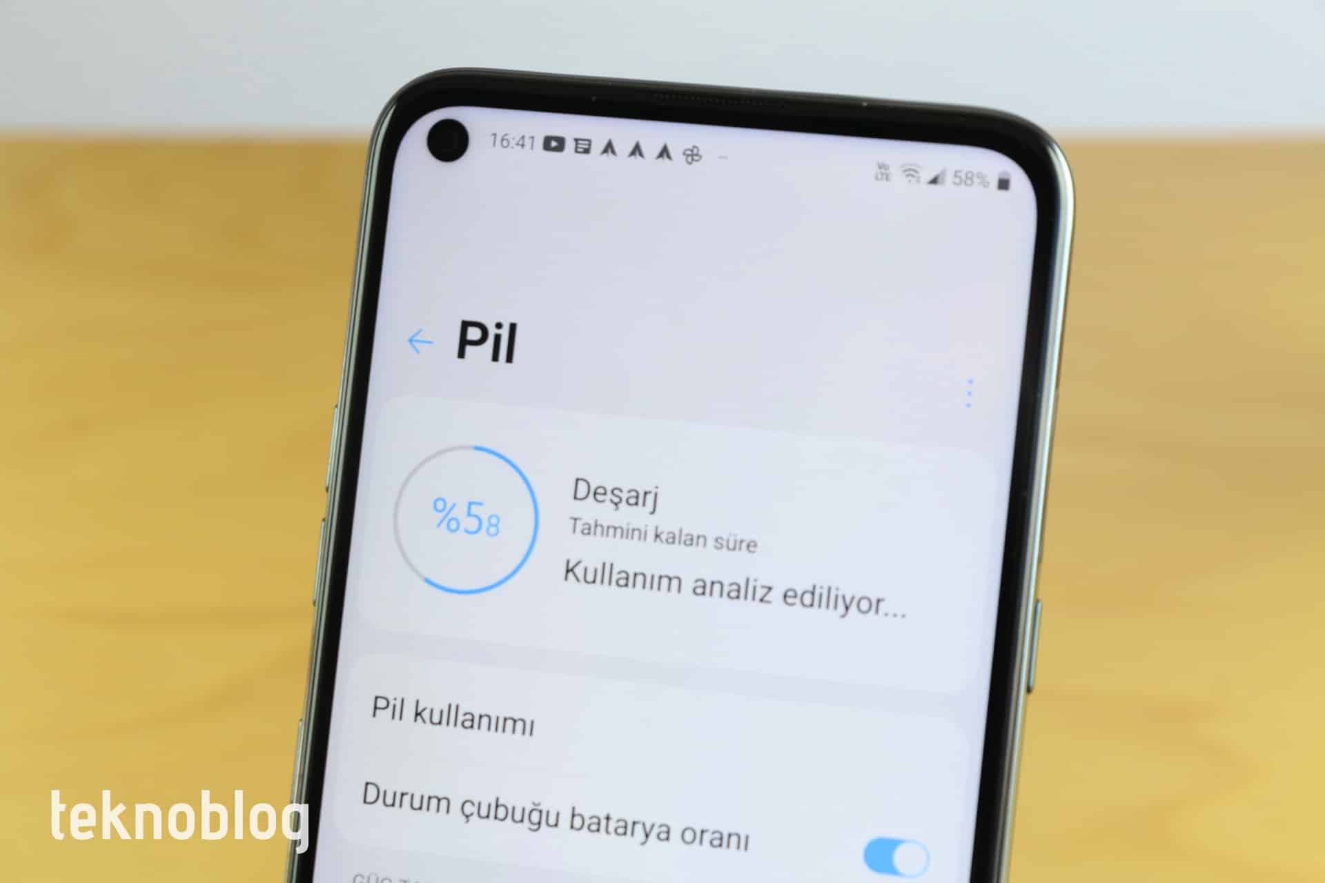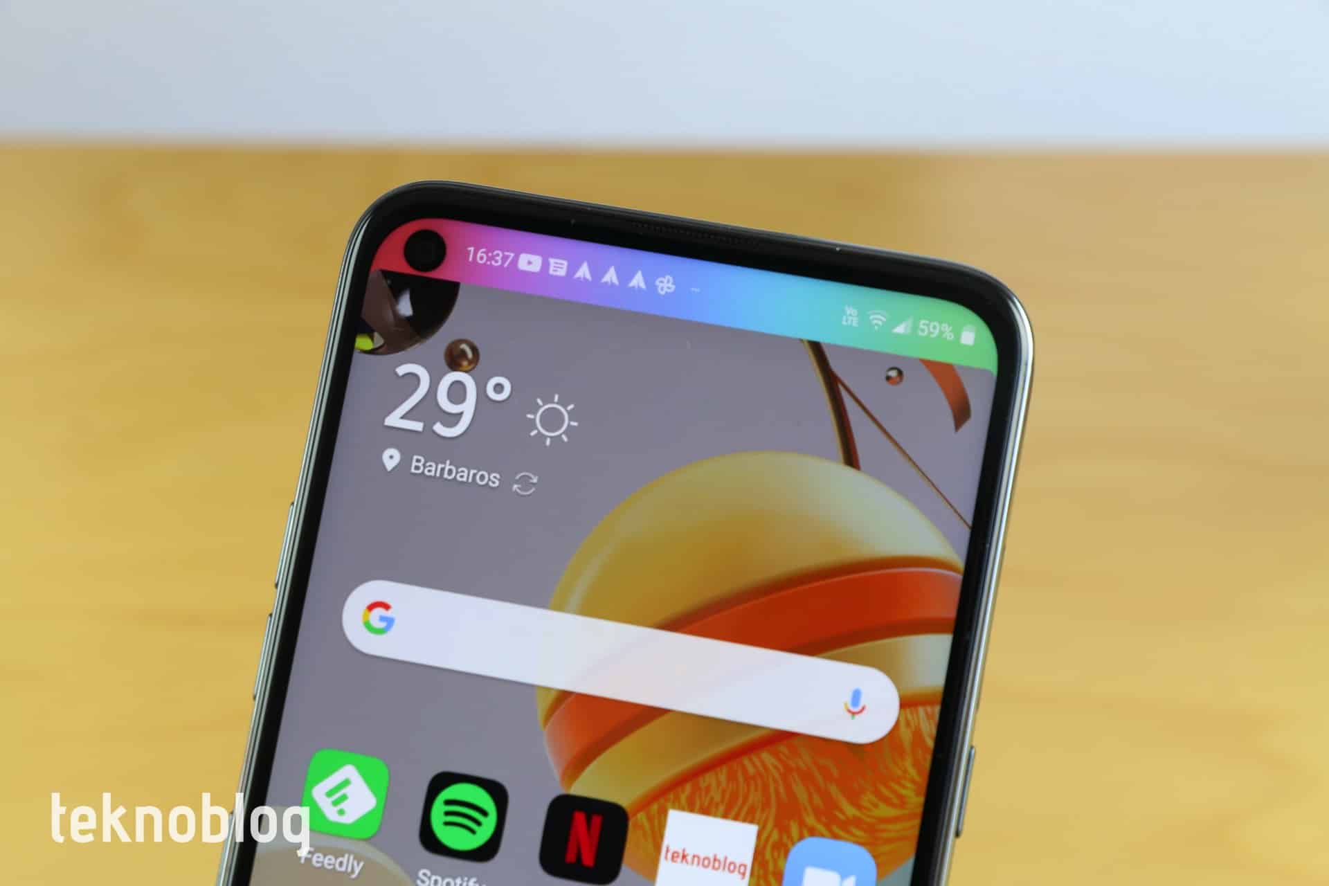 Telefonda 6.53 inçlik köşeden köşeye uzunluğa sahip ekran bulunuyor. Ekranın köşeleri gövdenin kavisli köşelerine uyum sağlıyor. Alt kenardaki biraz kalın çerçevenin dışında, diğer kenarların ince sayılabilecek kenarlara sahip olduğunu görüyoruz. Yüzde 82.5’lik ekran-gövde oranı ile de bu alanda ortalamanın üstüne çıkmayı başarıyor. Ekranın sol üst köşesinde de selfie kamera deliği bulunuyor.