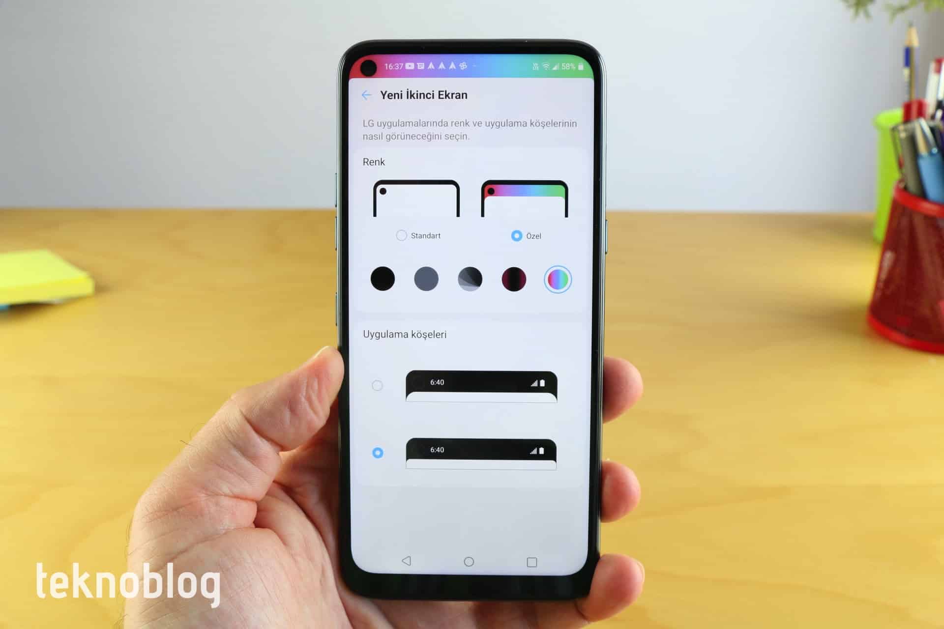 Ekranın sol üst köşesinde selfie kameranın yerleştirildiği bir delik bulunuyor. Bu tarz delikli ekran görünümlerine alıştık. Tam ekranda video izlerken veya oyun oynarken de herhangi bir rahatsız edici tarafı yok. Ancak LG, İkinci Yeni Ekran adını verdiği özellikle bu deliğin bulunduğu hattı özelleştirmeyi ve biraz daha klasik ekran görünümünü yakalamayı sağlıyor. İkinci yeni ekran olarak adlandırılan bölümün desenini veya rengini değiştirerek buranın daha farklı görünmesini sağlayabilirsiniz. Biz klasik görünüme bağlı kalmayı tercih ettik.