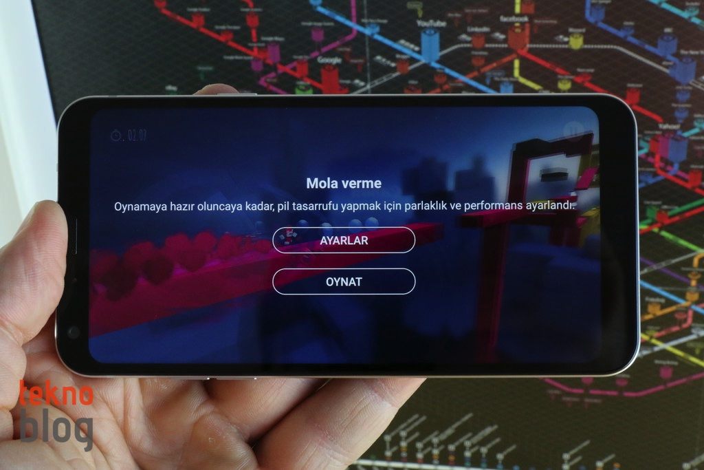 Oyun tarafında da LG Q6 orta segment bir telefondan beklediğimiz deneyimi sunuyor. Yüksek profilli oyunlarda grafik kalitesinde düşüşler söz konusu olsa da, akıcılık genel olarak korunuyor. Mola zamanı olarak adlandırılan özel bir mod oyunlar sırasında devreye giriyor. 5 dakikadan uızun süredir çalışan oyundan çıkarken parlaklık ve oyun performansı düşürülüyor. Bildirim panelinden de elle etkinleştirilebilen bu mod, oyuna ara verdiğinizde ekran parlaklığını azaltıyor.