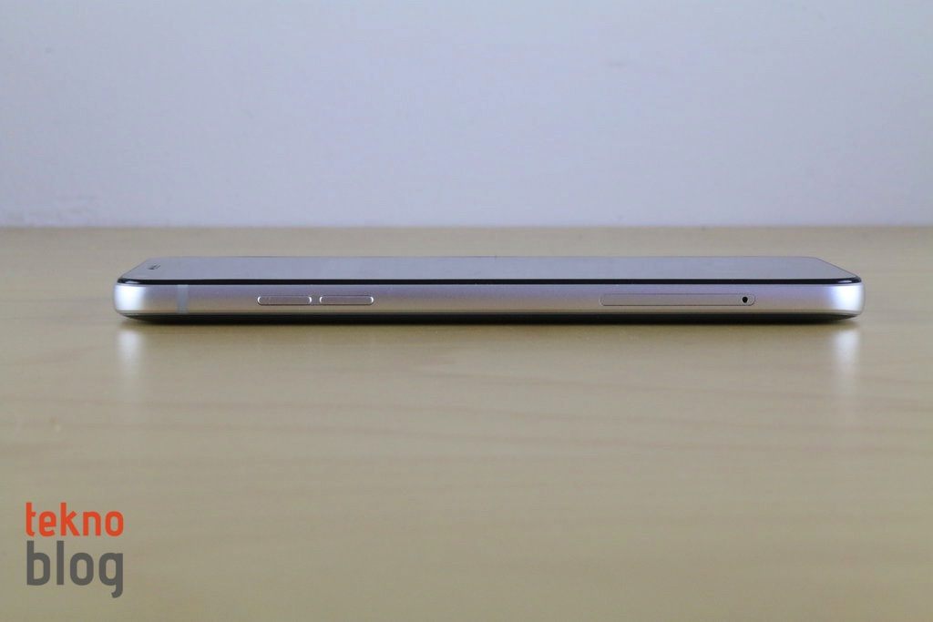 Ön yüzü 5.5 inç ekranın kapladığını söylemiştik. Bunun altında kalan dar bir alanda LG logosu yer alıyor. Üst kısımda ise ahize hoparlörü, sensörler ve 5 megapiksel kamera bulunuyor. Sol kenarda ses tuşları ve nanoSIM ve microSD kart yuvalarını barındıran tepsi var. Güç butonu ise sağ kenarda bulunuyor. Ses ve güç tuşları elde tutarken rahatlıkla erişilebilecek noktalarda bulunuyor.
