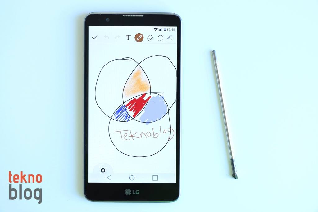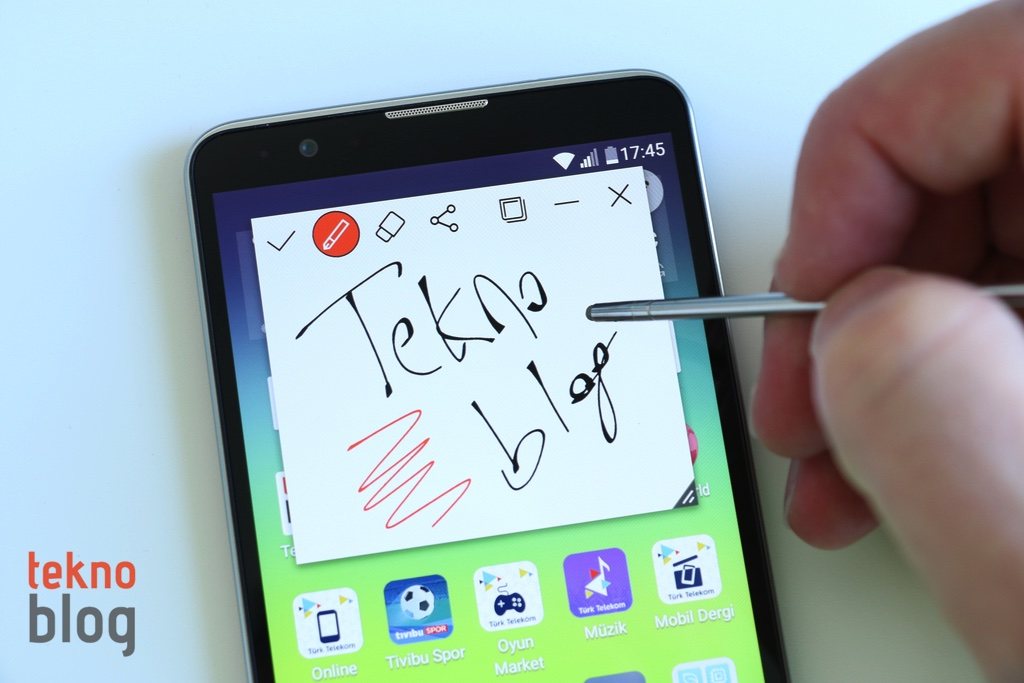 LG’nin bu telefonunun hoşumuza gitmeyen en önemli tasarım kararlarından bir tanesi stylus kalemin yuvası. Samsung, Note telefonlarında kapasitif kalemi alt kenardaki bir yuvaya yerleştiriyor. Bu da kalemin yerinden rahatlıkla çıkarılmasını ve kullanılmasını sağlıyor. Stylus 2’de ise kapasitif kalem üst kenarda, epey sağa doğru yerleştirilmiş bir yuva içinde gizli. Doğrusu bu yerleşim, kalemi Samsung’un telefonlarındaki kadar rahat almayı engelliyor. Öncelikle telefonu elinizle biraz çevirmeniz, bu şekilde kalemi daha rahat şekilde çıkaracak bir pozisyon elde etmeniz gerekiyor. Bunun dışında kalemin yerinden rahatlıkla çıkarıldığını belirtmemiz gerekiyor.