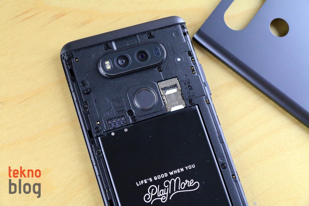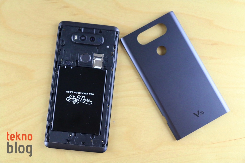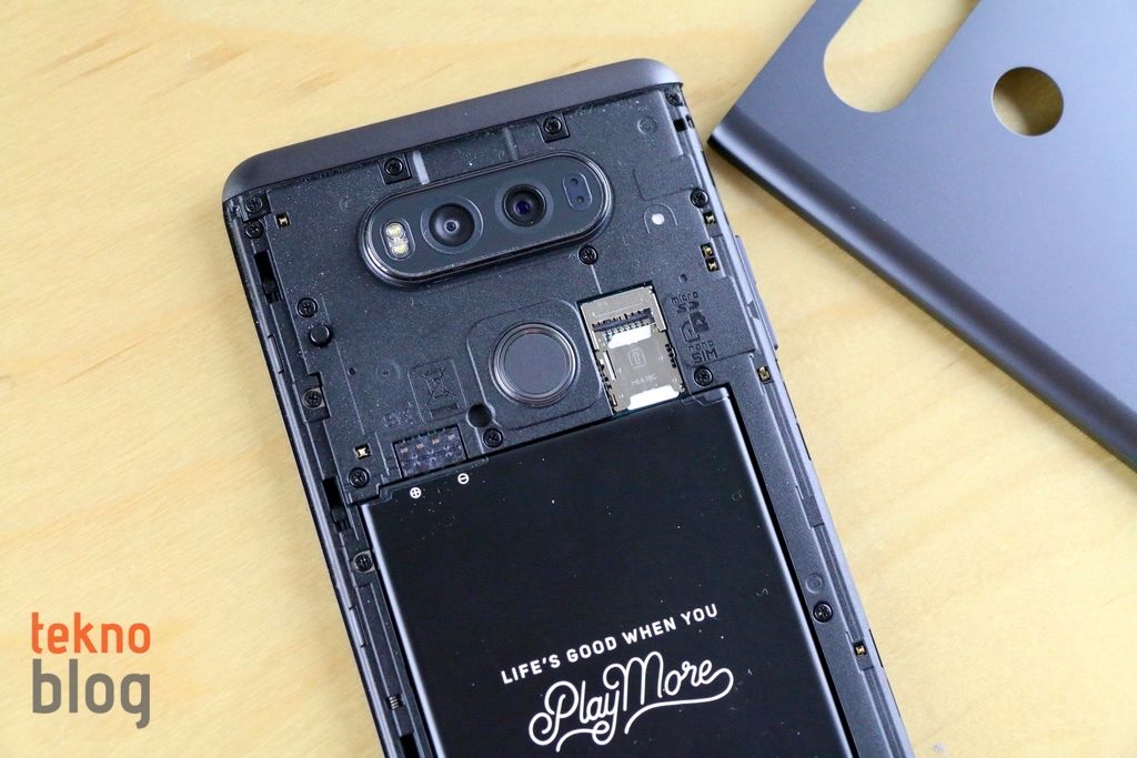 LG, pilin kullanıcılar tarafından çıkarılabilir olmasına önem vermeyi sürdürüyor. G5’te modüler yapı kullanılmıştı. V20’de ise daha geleneksel bir yaklaşım tercih ediliyor. Metal arka kapak, sağ kenarda alta doğru yerleştirilmiş düğme yardımıyla sabitlendiği yerden çıkarılabiliyor. LG bu düğme mekanizmasıyla arka kapağın biraz daha sağlam olmasını garanti altına almak istemiş olmalı. Arka kapak çıkarılabilir olsa da, bu kapak kullandığımız süre boyunca, defalarca çıkarıp takmamıza rağmen oynama yapmadı. Kapağı kaldırdığınızda 3200 mAh kapasiteli pili göreceksiniz. microSD ve nanoSIM kart yuvaları ise pil yatağının hemen üstünde. Bellek veya SIM kart değişimi için pili çıkarmak, dolayısıyla V20’yi kapatmak gerekiyor.