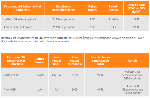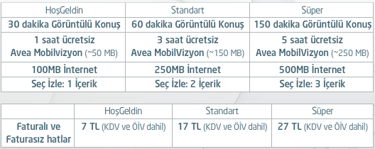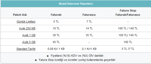 Turkcell ve Vodafone’un mobil internet tarifelerine baktığımızda, aynı paketin faturalı ve faturasız hatlara özel fiyatlarının farklı olduğunu, faturasız hatlar için fiyatın daha yüksek olduğunu görüyoruz. Üstelik her iki hat kategorisinde de KDV ve ÖİV fiyatlara dahil edilmiş durumda. Avea ise müşterilerine biraz daha insaflı davranıyor. Bu operatörün tarifelerine baktığımızda tüm internet paketleri için belirlenen fiyatların faturalı ve faturasız hatlar için aynı belirlendiğini görüyoruz. Yazının devamında operatörlerin internet tarifelerini bulabilir, karşılaştırma yapabilirsiniz.