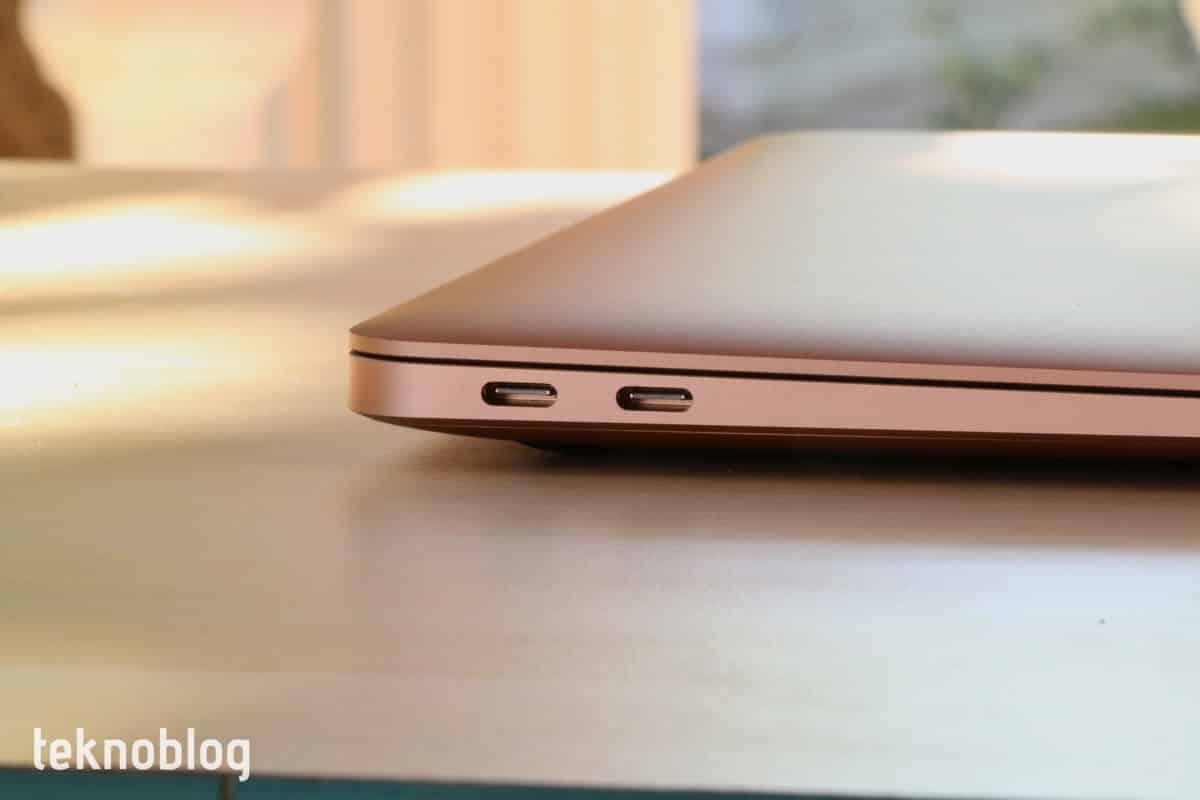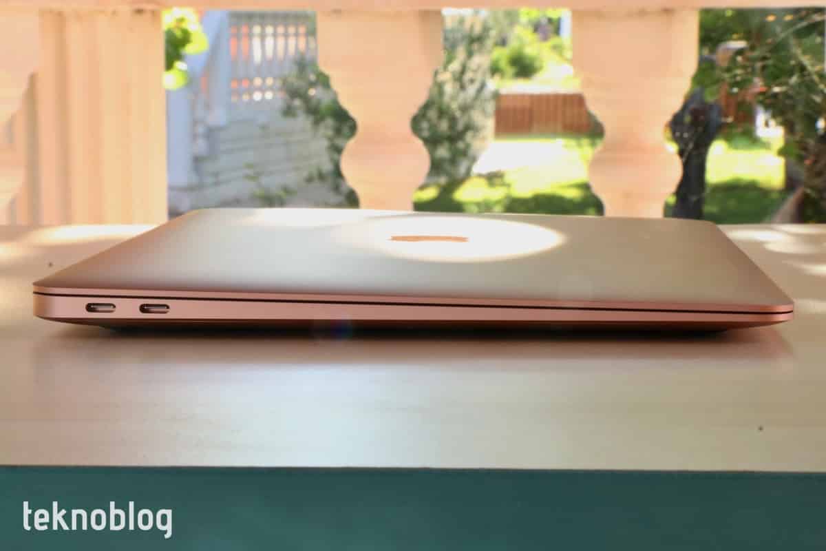 Alüminyum gövdesiyle MacBook Air şık bir dizüstü bilgisayar. Tabana yerleştirilmiş dört adet tampon sayesinde dizüstü bilgisayarın yine metalden yapılan taban kısmı korunuyor. Hava çıkış kanalı ise menteşenin bulunduğu yerde bir kenardan diğerine doğru uzanıyor. Sol kenarda iki adet USB-C biçiminde Thunderbolt 3 portu bulunuyor. Sağ kenarda ise 3.5mm kulaklık jakını görüyoruz.