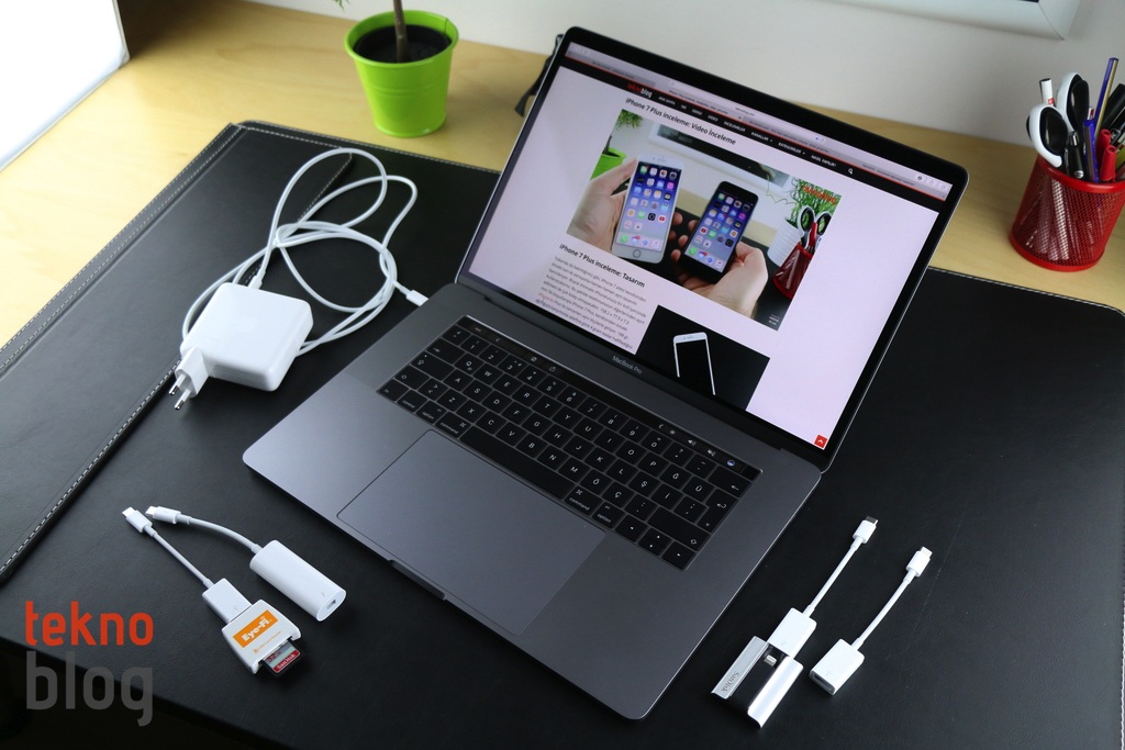 Dört portun temel niteliği Thunderbolt 3 desteği olsa da, onların USB-C formunda olması kullanıcıların günlük hayatını daha fazla etkileyen faktör olacaktır. Çoğu kullanıcının sahip olduğu cihazlar genellikle USB olarak andığımız USB-A tipi konnektörlerle bilgisayarlara veya şarj adaptörü benzeri cihazlara bağlanıyor. Halbuki MacBook Pro’da bu türde bir port yok. Bu durum mevcut cihazları bağlamak için bir adaptör kullanımını gerekli kılıyor. Benzer şekilde, HDMI ve DisplayPort gibi, daha önce var olan bağlantılar da olmadığı için, bu bağlantılar üzerinden işleyen, görüntü aktarımı sağlayan cihazlarla bağlantı için de adaptöre ihtiyaç var. Ya da MacBook Pro’yu bir ethernet kablosuyla ağa bağlamak isterseniz, öncelikle Thunderbolt 2 – Ethernet adaptörünü, daha sonra da Thunderbolt 2 – Thunderbolt 3 adaptörünü kullanmalısınız. Kısacası, şu anda MacBook Pro’yu mevcut cihazlarınızla kesintisiz şekilde kullanmak istiyorsanız, adaptörlü yaşama alışmanız gerekiyor.