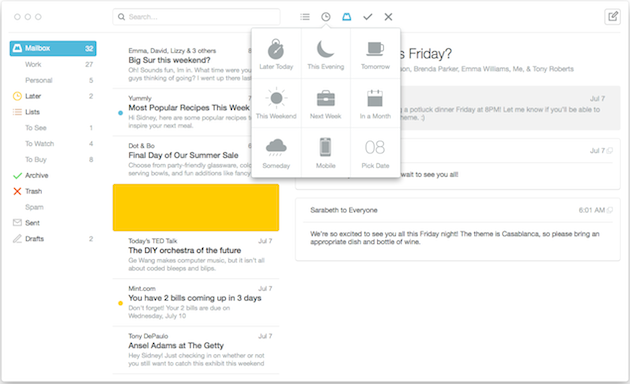 Mailbox’ın dokunmatik hareketleri yardımıyla iletileri sonra okuma için öteleme ve onları ihtiyaç duyduğunuzda yeniden gösterme imkanınız bulunuyor. Yani bir mesajı günün ilerleyen saatlerinde ve hatta gelecek ay görüntülemek üzere gelen kutunuzdan yok edebiliyorsunuz. Mailbox Mac üzerinde yaptığınız bütün değişiklikler akıllı telefon uygulamasına yansıtılıyor, bunun tersi de geçerli oluyor.