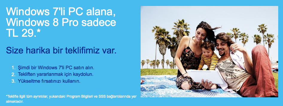 Microsoft Windows Yükseltme Teklifi için kayıt almaya başladı. Bu kapsamda 2 Haziran 2012 ile 31 Ocak 2013 tarihleri arasında bir Windows 7 bilgisayar satın alanlar Windows 8 Pro’yu sadece 29 TL karşılığında edinebilecekler. Kayıt sürecini kaçıranların yeni yazılım için tam fiyatını ödemeleri gerekebilir.