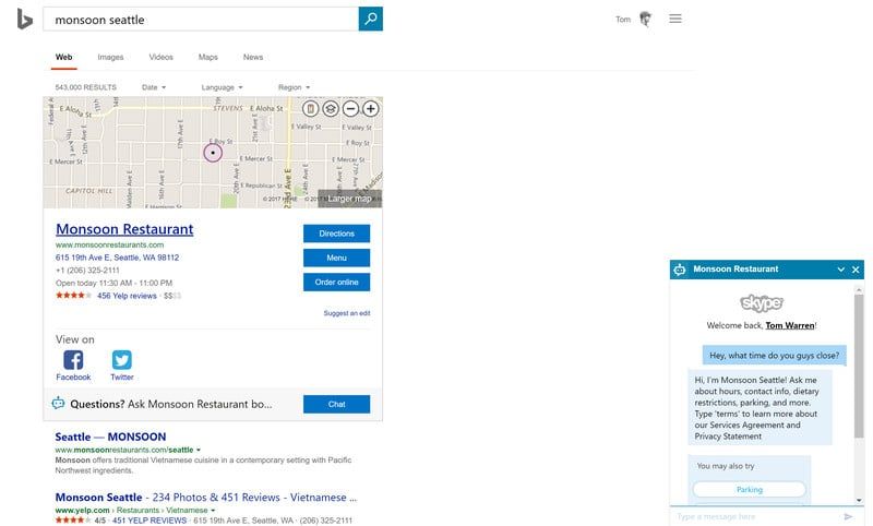 Bing.com üzerindeki mevcut botlar, Seattle’daki Monsoon isimli bir restoran için yapılan aramalarda görülebiliyor. Yeni bir seçenek restoran ile Skype üzerinden sohbet etmeyi ve çalışma saatleri ya da park durumu gibi konular hakkında bilgi almayı sağlıyor. Önümüzdeki dönemde daha fazla şehirde bu imkanın sunulması öngörülüyor.