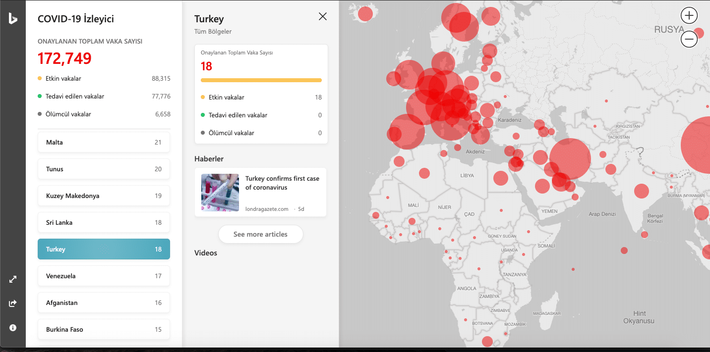 Microsoft’un interaktif haritasında ülkelere dair bilgilerin yanı sıra ilgili haber ve video bağlantılarını görmek de mümkün oluyor. Ancak buradaki haber ve videoların çok da güncel olmadığını söylemek gerekiyor. İstatistikler güncel olsa da, haber ve videolar salgının güncel hâlini anlamaya yardımcı olmuyor.