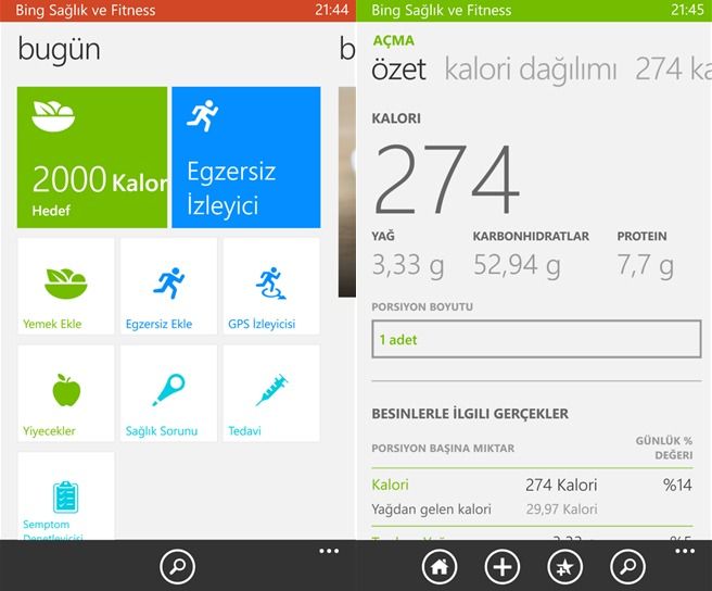 Bing Sağlık ve Egzersiz uygulaması GPS takipçisi sayesinde yürürken, koşarken, bisiklet binerken veya diğer aktiviteleri gerçekleştirirken geçen zamanı, gidilen mesafeyi, hızı ve yakılan kalori miktarını kaydediyor. İzleme verileri aynı hesaba bağlı diğer Windows 8 cihazlarıyla el zamanlanabilirken günlük kalori hedefi, alınan besinlerin kalori kayıtlarının tutulması ve 300 binin üzerinde yiyecek için besin değeri bilgilerinin alınması da uygulamanın unsurları arasında yer alıyor.