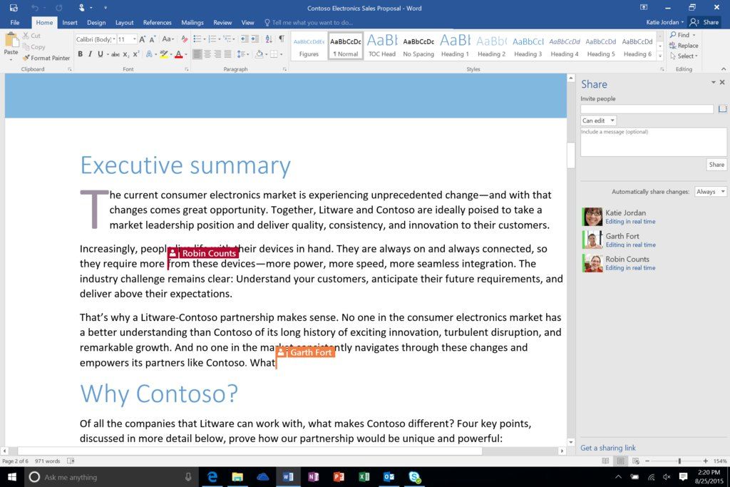 Office 2016 uygulamaları ekiplerin bir araya gelmesini kolaylaştırıyor ve takım çalışmasını destekliyor. Eşzamanlı yazma asistanı artık hem Word, hem Powerpoint hem de OneNote masaüstü versiyonunda mevcut. Eşzamanlı yazma ile Word dökümanında diğer takım arkadaşlarınızın yaptığı değişiklikler de görülebilecek.