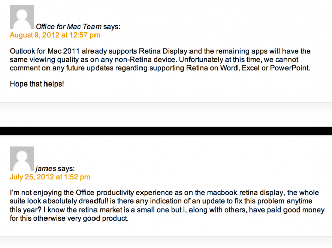 Retina ekranlı MacBook Pro sahiplerinin yakın zamanda artan güncellemeye ilişkin soruları üzerine şirket yetkilileri, Outlook uygulamasının Retina uyumlu hale geldiğini ancak diğer Office elemanlarının yola Retina uyumundan yoksun olarak devam edeceklerini belirttiler. Bunun Office 2011’i sıklıkla kullanan yeni MacBook Pro sahipleri için iyi bir haber olmadığı kesin. Microsoft Office 2013’ün Mac versiyonunun yayınlanmasının da bir süre için pek olası olmadığı göz önüne alınınca, Retina ekrandan tam verim almak isteyen cihaz sahipleri için diğer uygulamalara şans vermek iyi bir fikir gibi duruyor.