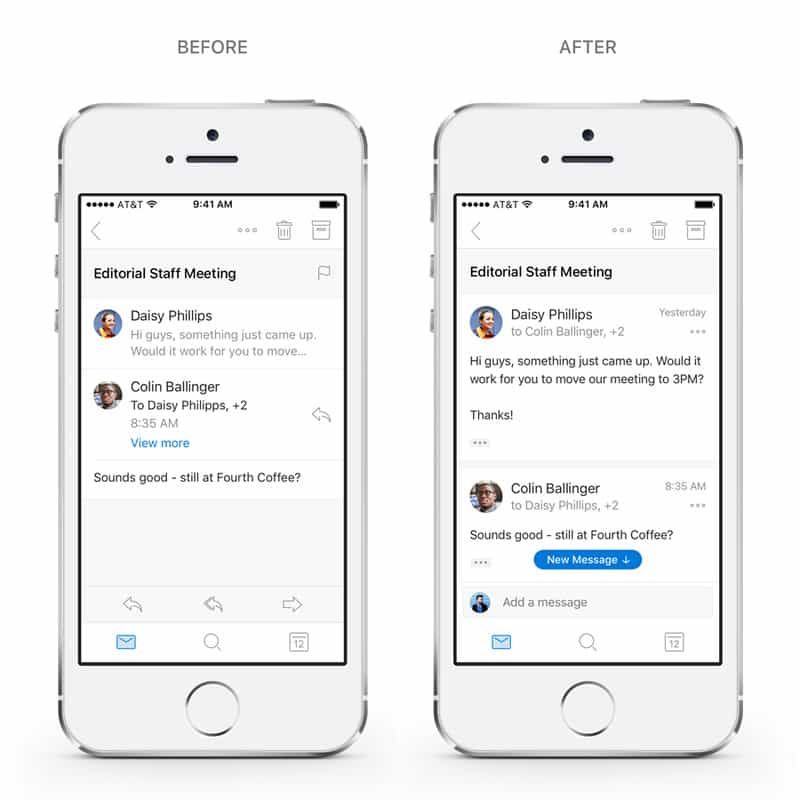 Yeni hesaplar ve sohbetler özellikleri ilk olarak Outlook iOS uygulamasını kullanan Outlook.com ve Gmail hesaplarına ulaştırılıyor. Office 365 desteği ise önümüzdeki günlerde aktif hâle gelecek. Yeni arama deneyimi de yakında iOS kullanıcılarıyla buluşacak. Microsoft yeni deneyimlerini Android kullanıcılarına da iki aylık süre içinde ulaştırmayı planlıyor.