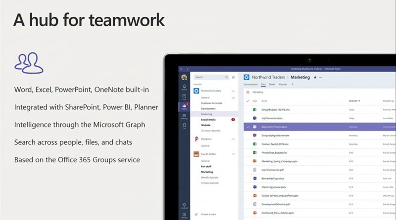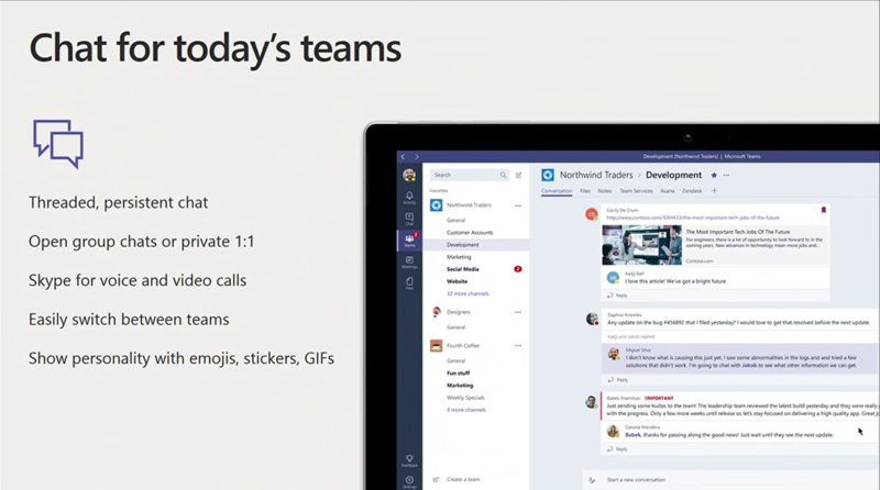 Şirketin CEO’su Satya Nadella, Microsoft Teams’in sohbet, toplantı, notlar, Office, Planner, PowerBI ve bir dizi eklenti ve uygulamayla ekiplere işlerini yapmaya yardımcı olacağını söylüyor. Slack’e epey benzeyen bu servis sohbet dizileri ve bire bir sohbet gibi özelllikleri de bünyesinde barındırıyor. Ayrıca benzer görünüme sahip bir kenar çubuğu da toplantılara, dosyalara, sohbetlere ve hareket bildirimlerine erişmeye olanak sağlıyor. Sohbet görünümünde toplantıları ve aynı zamanda dosyaları, notları ve proje panolarını sohbete ekleme imkanı bulunuyor.