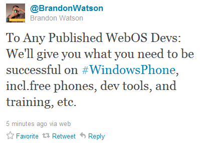 Windows Phone 7 Kıdemli Direktörü Brandon Watson Twitter üzerinden geçtiği mesajda webOS geliştiricilerine Windows Phone platformuna geçiş yapmaları karşılığında ücretsiz telefonlar, geliştirici araçları ve eğitimler vaat etti. Her ne kadar HP, webOS’ten uzaklaşmayacağını söylese de, cihaz üretimini bırakmış olmaları yukarıda belirttiğimiz gibi webOS’in geleceğini şu an için belirsiz kılıyor. HP bu platformu başka üreticilere lisanslama veya platformu tamamen satma seçeneklerini değerlendirebilir.