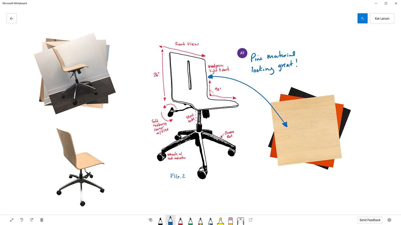 Whiteboard uygulaması sayesinde Windows 10 kullanıcıları resimler üstüne mürekkeple çizim yapabiliyor, taslaklar oluşturabiliyor veya sanal pano üzerine notlar alabiliyor. İsteyen herkes bu uygulamayı kullanabilir, ancak çok kişili katılımcı desteği gruptaki herhangi birisinin aktif Office 365 aboneliğine sahip olmasını gerektiriyor.