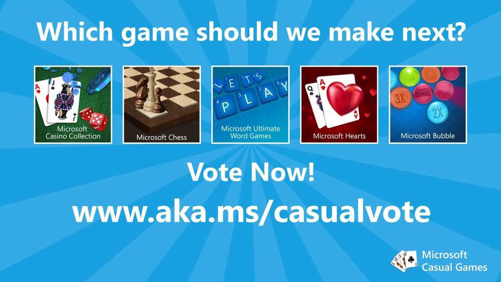 Microsoft’un Solitaire Collection ve Mayın Tarlası gibi oyunlara imza atan Casual Games ekibi, şu sıralar hangi klasik oyunu tekrar canlandıracağı üzerine düşünüyor. Bunun için beş klasik oyundan oluşan bir liste hazırlayan ekip, son kararı potansiyel oyuncuların vermesini istiyor. 17 Aralıkta sona erecek oylama sonucunda Casual Games ekibinin yeniden canlandıracağı klasik oyun seçilmiş olacak.
