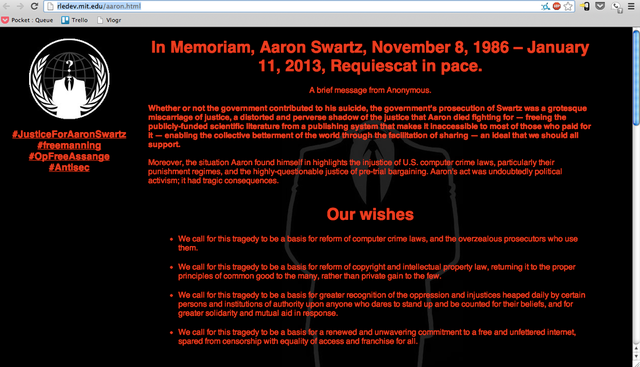 İnternetin en popüler korsan topluluklarından Anonymous, Massachusetts Institute of Technology’ye (MIT) bazı web sayfalarına geçtiğimiz günlerde hayatına son veren Aaron Swartz’ı anmaya yönelik bir metin yerleştirdi. Aaron Swartz’a yönelik yargılama sürecini ”adaletin iğrenç bir başarısızlığı” olarak tanımlayan grup, sürecin ABD’nin bilişim suçlarına yönelik yasalarının adaletsizliğini de yansıttığının da altını çizdi. Telif hakkı ve fikri mülkiyet yasalarında reform talep eden Anonymous, özgür internete yönelik yenilenmiş ve sarsılmaz bir bağlılığa ihtiyaç olduğunu vurguladı.