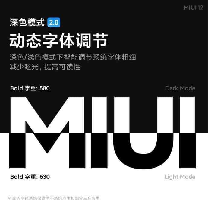 Ayrıca Xiaomi, koyu ve açık modlar arasında geçiş yapan kullanıcılara metnin gösterilme biçiminde de değişiklikler yapıyor. MIUI 12 ile birlikte telefon, koyu mod açıldığı zaman parlamayı azaltacak şekilde yazı tipinin büyüklüğünü ve kalınlığını otomatik olarak ayarlıyor. Kullanıcının bulunduğu ortamdaki ışığa göre yazı tipinin kontrastı da ayarlanacak. Bu sayede düşük aydınlatmanın bulunduğu ortamlarda metin görünürlüğü önemli oranda artacaktır.