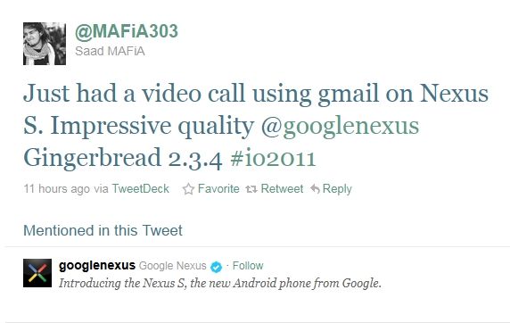 Samsung ile çalıştığını iddia eden MAFiA303 rumuzlu bir Twitter kullanıcısı, Samsung tarafından üretilmiş bir Google telefonu olan Nexus S üzerinde çift yönlü video görüşme işlevini test ettiğini iddia etti. Söz konusu video görüşme işlevinin etkileyici bir kalite sunduğunu söyleyen bu kişi gelecek ayki Google geliştirici etkinliğinde bu özelliğin tanıtılacağı tahmininde de bulundu.