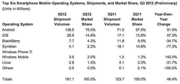 2012’nin ikinci çeyreğinde satılan akıllı telefonların büyük kısmını Android işletim sistemli cihazlar oluşturmuştu. Yılın üçüncü çeyreğinde de bu durum değişmedi ve bu dönem içinde satılan akıllı telefonların yüzde 75’i Google’ın mobil işletim sistemi ile satıldı. Bu çeyrekte sevkiyatı gerçekleştirilen toplam Android işletim sistemli cihaz sayısı ise 136 milyon oldu. Bu rakam bir çeyrekte ulaşılan en yüksek rakam olması açısından da önem taşıyor.