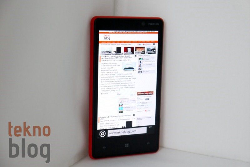 Nokia Lumia 820’nin 4.3 inç ekranının 480 x 800 piksel gibi nispeten düşük bir çözünürlüğe sahip olması Lumia 920’deki HD ekranı gördükten sonra biraz da olsa suratların düşmesine neden olabilir. Halbuki gerçekte durum o kadar kötü değil. Gerçekten düşük çözünürlük nedeniyle pikselleri biraz daha rahat farkediyorsunuz, ancak yine de karşımızda kontrast ve keskinlik açısından tatmin edici, ayrıca parlak bir ekran var. Tabii ki bunda Nokia’nın ClearBlack AMOLED ekran kullanmasının rolü büyük. Güneş ışığı altında iyi bir görüş sunan ekranın görüş açısı da oldukça yüksek, ekrana farklı açılardan baktığınızda da renk kalitesinin aynı kaldığını göreceksiniz. Sonuç olarak Nokia Lumia 820’nin 4.3 inç WVGA ekranı Windows Phone 8’in canlı kutucuklarını ve diğer arayüz unsurlarını oldukça düzgün bir şekilde gösteriyor. Yalnızca web sitelerini gezerken genel görünümde küçük yazıları okumakta biraz zorlanabilirsiniz.