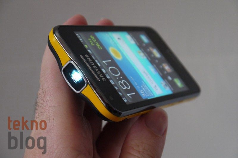 Samsung Galaxy Beam’in üst kenarında cihaza adını veren dahili nHD projektör bulunuyor. Bu projektör 15 lümenlik bir parlaklık değerine sahip. Projektörün varlığı nedeniyle cihazı üst bölümünün ortaya doğru hafif genişlediğini görüyoruz. Bu genişleme kavisli bir yapıda tasarlandığı için çok fazla sırıtmıyor. Benzer şekilde projektörün varlığı arka bölümde üste doğru hafif bir bombeli yapıya yol açıyor.