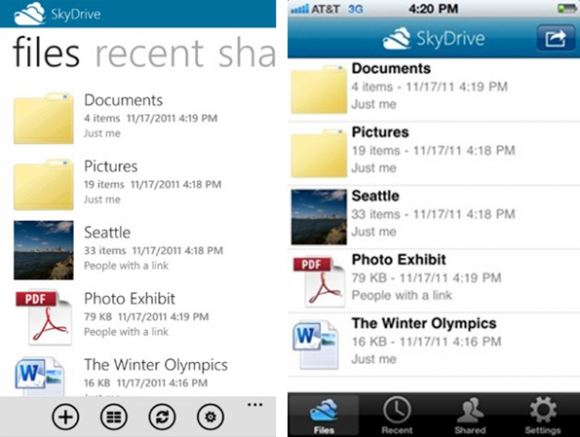 SkyDrive’ın iTunes App Store üzerinden ücretsiz olarak indirilen iOS versiyonu iPhone sahiplerinin SkyDrive alanındaki dosyalarına düzenli bir arayüz üzerinden erişimini sağlıyor. Kullanıcılar uygulama sayesinde klasör, fotoğraf albümü oluşturma, silme, kaydetme gibi işlemleri gerçekleştirebiliyor. SkyDrive üzerinde saklanan ofis dokümanlarını veya fotoğrafları açmak, bunları başkalarıyla paylaşmak mümkün. Ayrıca en son açılan veya düzenlenen dokümanlar da özel bir sekme altında gösteriliyor.