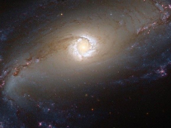 NASA’nın Hubble Uzay Teleskobu 45 milyon ışık yılı uzaklıkta buluann bir galaksinin fotoğrafını yakaladı. Yeni bir yıldız formasyonunun doğuşunu temsil eden bu fotoğrafta güçlü bir kara delik maddeyi tüketirken görülüyor. NGC 1097 olarak adlandırılan galaksinin ortasında yer alan kara delik bizim güneşimizden 100 milyon kat daha büyük kütleye sahip. Yeni bir yıla girilirken paylaşılan bu fotoğraf yeni güneş sistemlerinin evrimini temsil ediyor.