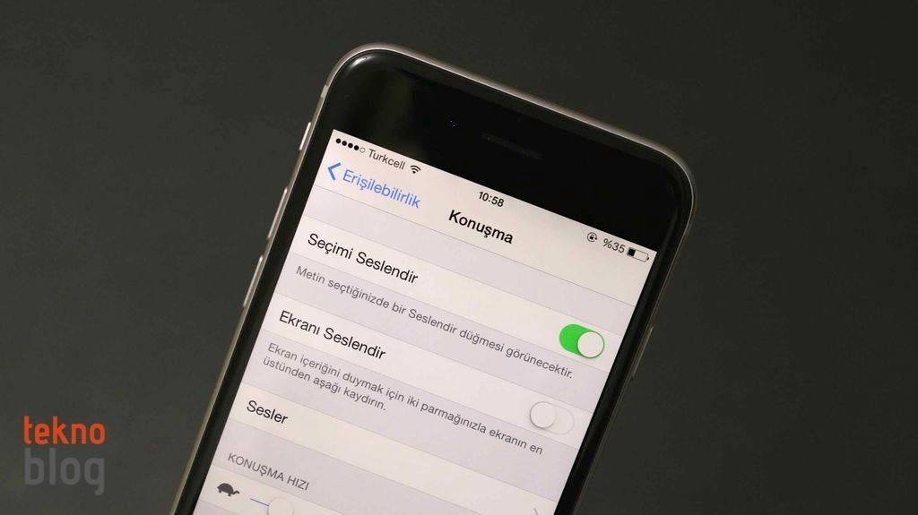 - Seçimi Seslendir özelliğini açtığınızda Konuşma sayfası üzerinde görünecek Konuşma Hızı bölümünden seslendirmenin hızını ayarlayabilir ve Sesler bölümü içinden de konuşma dilini belirleyebilirsiniz.