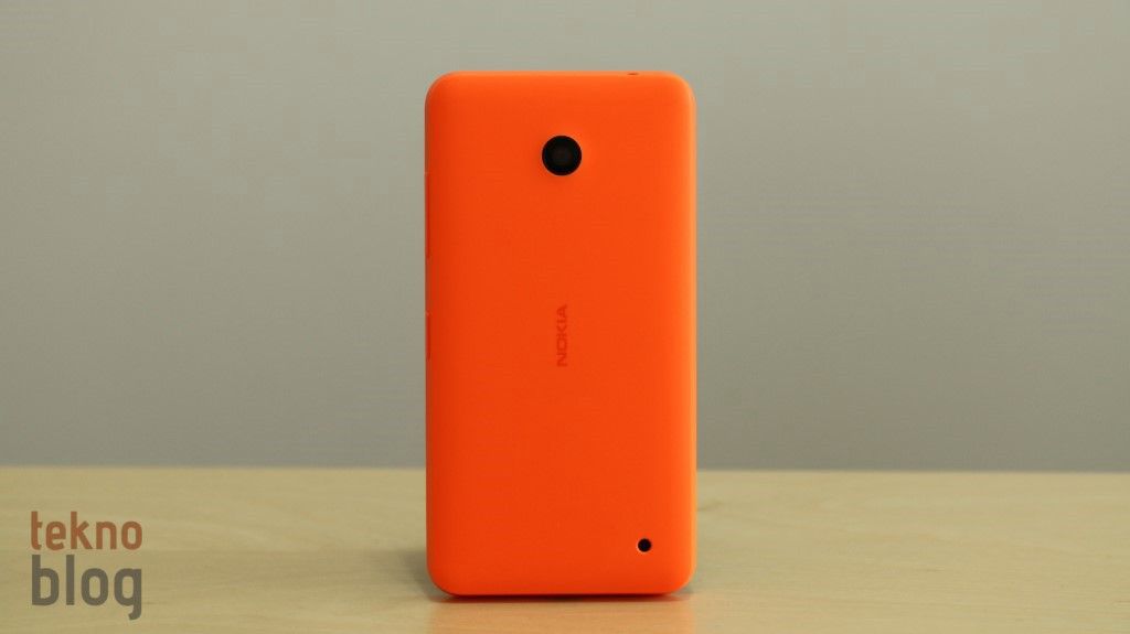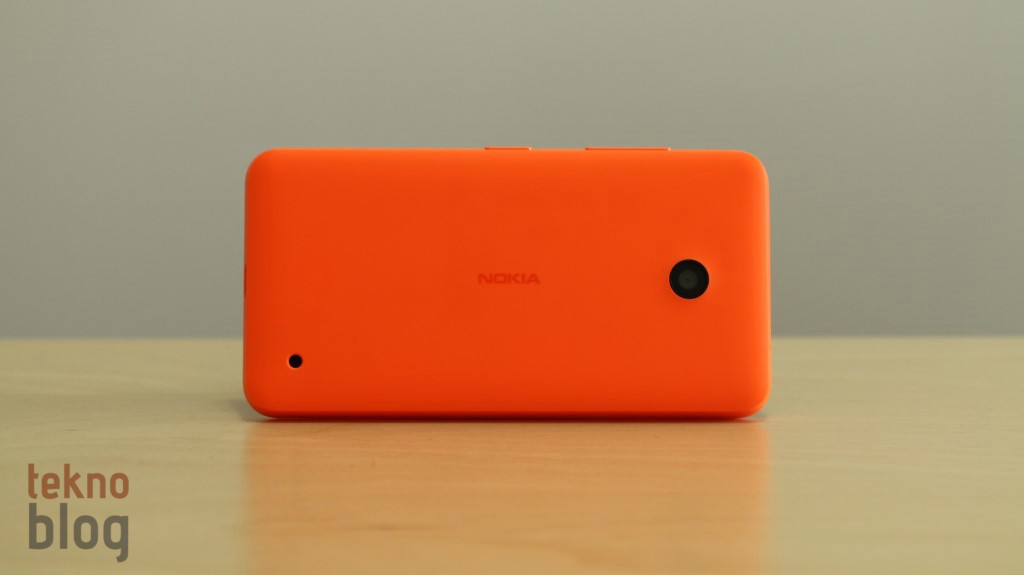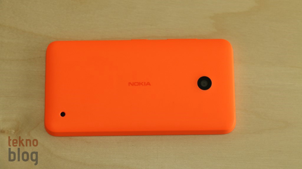 Arkadaki dizilim de diğer giriş veya orta seviye Nokia Lumia telefonlarındakine benzer şekilde. 5 megapiksel kamera mevcut, ancak yanında flaş görmüyoruz. Bu kamera ile aynı yatay eksende Nokia logosu bulunuyor. Küçük bir hoparlör deliği de telefona arkadan yatay konumdayken bakıldığında sol alt köşede yer alıyor.