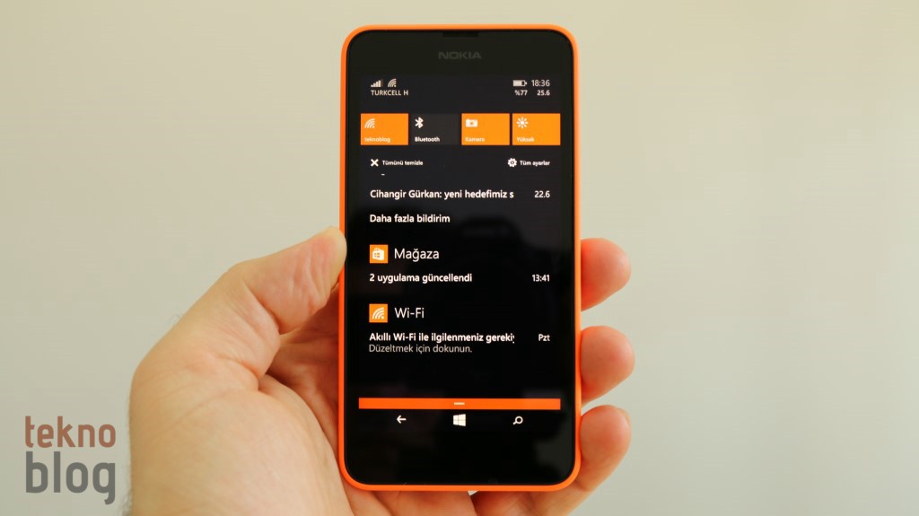 Windows Phone 8.1’in en fazla memnun eden noktalarından bir tanesi bildirimler için özel bir alanın sunulması. Daha önce Windows Phone telefonlarına gelen bildirimler kaybolup gidiyordu. Artık ekranın üstünden aşağı doğru sürüklendiğinde açılan, tıpkı iOS ve Android’de olduğu gibi bir bildirim merkezi bulunuyor. Burada her bir uygulamanın bildirimlerini liste hâlinde görmek mümkün oluyor. Bunun yanı sıra aynı alan içinde Wi-Fi, Bluetooth, ekran parlaklığı gibi sık kullanılan araçlar ve ayarların hızlıca kontrol edilmesini sağlayan düğmeler bulunuyor.