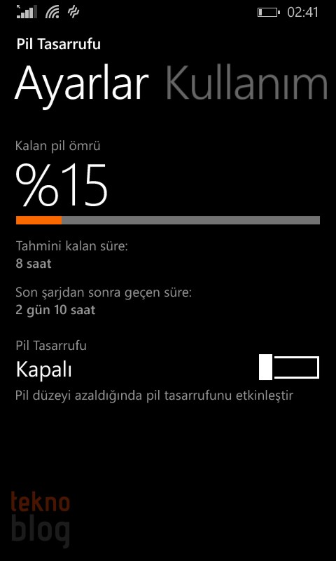 1830 mAh batarya düşük kapasiteye sahip gibi görünse de, Lumia 630 için yeterli sayılır. Eğer çok yoğun şekilde kullanırsanız akşam vakitlerine geldiğinizde pilin bitmek üzere olduğunu görebilirsiniz, ancak normal kullanımda bir günü rahatlıkla çıkarır gibi görünüyor. Seyrek kullanımlarda pilde çalışma süresi 2-3 güne bile çıkabiliyor. Pilin erişilebilir ve değiştirilebilir olması sayesinde yedek bir pille rahatlıkla yola devam etmek de mümkün oluyor.