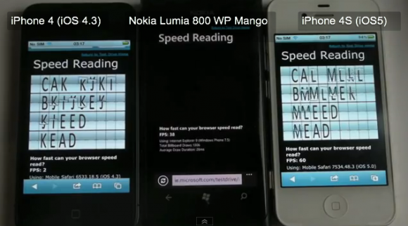 Microsoft IE9’un mobil versiyonunu barındıran Windows Phone 7.5 Mango cihazlarının iPhone’da yer alan mobil Safari’yi benchmark testlerinde geçeceğini iddia etmişti. Ancak 359gsm rumuzlu bir YouTube kullanıcısı tarafından gerçekleştirilen benchmark testleri aksini iddia ediyor. Nokia Lumia 800’ü iPhone 4S ve iPhone 4 ile yan yana koyan site editörleri Lumia 800’ün iki Apple telefonunun da gerisinde kaldığını gördü.