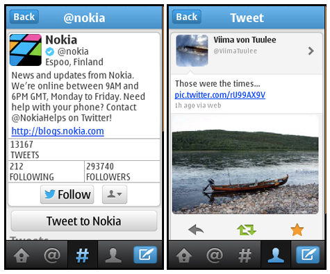 Twitter, Nokia Series 40 telefonları için resmi bir uygulama çıkardı. Uygulamanın özellikler listesine bakıldığında yeterince zengin olduğu görülüyor, akıllı telefonlardaki eşlerinde yer alan işlevlerin çoğunun S40 versiyonunda da sunulduğunu görüyoruz. Uygulama içinde Zaman Çizgisi, Bahsedenler, Bağlan, Ben ve Yaz olmak üzere beş farklı sekme yer alıyor.