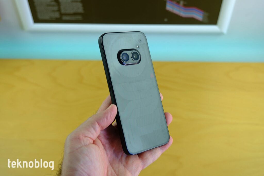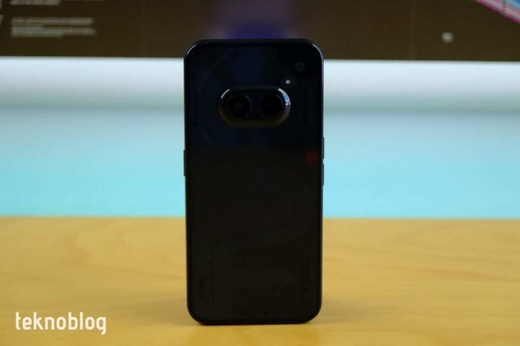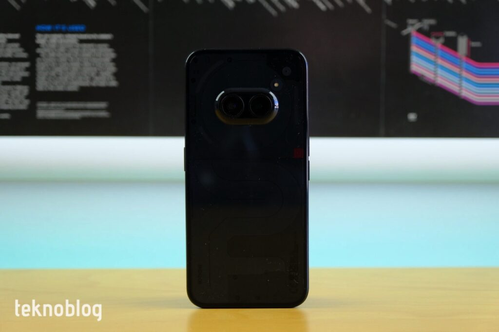 Nothing telefonlarında gördüğümüz şeffaf arka yüz tasarımı burada da mevcut. Arkaya baktığınızda telefonun içindeki bileşenleri görmeniz mümkün oluyor. Kameranın etrafındaki daire NFC alıcısını, alt taraftaki iç içe geçmiş eğriler de ekran ile SIM kart yuvasının devre kartı ile bağlantısını sağlıyor. Vidalar ve diğer detaylarla gerçekten hoş görünen bir tasarımın varlığı söz konusu. Ancak bu şeffaf arka yüz tasarımı en iyi biçimde beyaz renkte fark ediliyor. Elimizdeki siyah renkli versiyonda, içerideki bileşenleri fark etmeniz için telefonu ışığa tutmanız gerekiyor.
