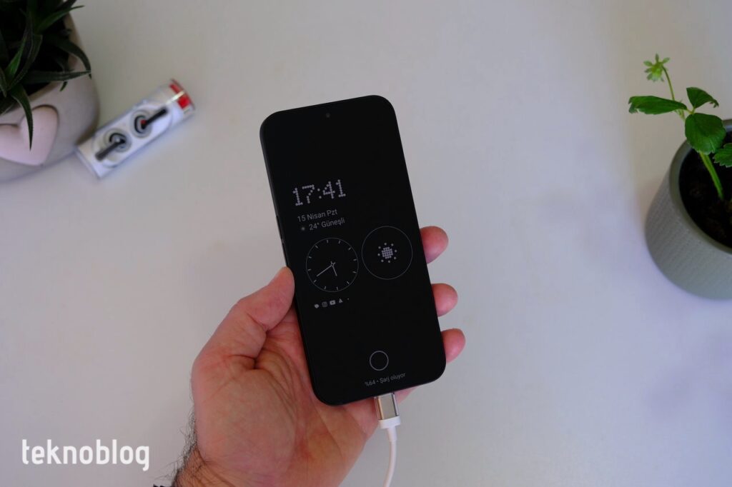 Ekranın siyah renk derinliği gayet iyi, bu durum renklerin daha canlı ve gerçekçi görünmesine yardımcı oluyor. Renk sıcaklığı dengeli, beyazların görünürlüğü gayet iyi. Ekran ayarları içinde Canlı ve Standart olmak üzere iki ayar var, ancak bu ikisi arasında renkler açısından pek fark yok gibi görünüyor. Ancak Standart ayarında ekranın renk sıcaklığını isteğinize göre değiştirebilirsiniz. AMOLED ekranın varlığı Always-on Display özelliğinin de verimli biçimde kullanılmasını beraberinde getiriyor. Ekran kapalıyken saat, bildirim simgeleri, tarih gibi unsurlar ekranda görülebiliyor. Öte yandan Nothing, saat ve hava durumu gibi çeşitli bileşenlerin de kapalı ekranda göstermenizi sağlıyor. Bileşen seçeneği çok fazla değil, ancak sunulan analog saat ve hava durumu simgeleri de yeterli görünüyor. Dijital saat, pil göstergesi, hatta pil şarj gösterimi gibi kapalı ekran unsurlarında Nothing’in simgesi olan yazı tipinin kullanıldığını da görüyoruz.
