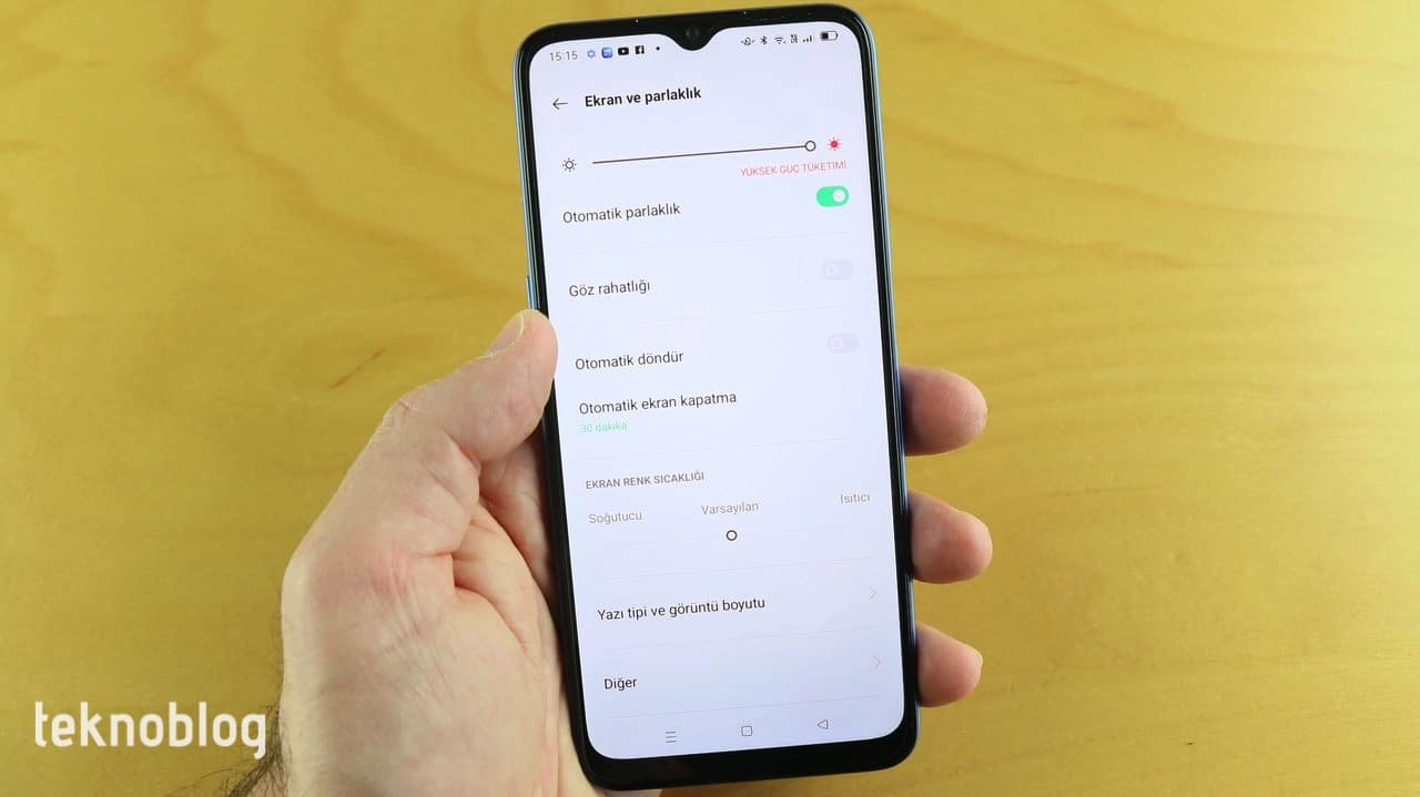 Ekranın 480 nitlik tipik parlaklık değeri var ve bunun segmentindeki bir telefon için ortalamanın üstünde olduğunu rahatlıkla söyleyebiliriz. Bunun pratikte yansımalarını da iyi biçimde görüyoruz. Dışarıda da bu ekran rahat bir kullanım imkanı sağlıyor. IPS LCD teknolojisine sahip olmasına bağlı olarak görüş açıları geniş. Tabii ki, ekrana iyice kenardan baktığınızda renklerde ve parlaklıkta azalmalar oluyor, ancak ekranda neler olduğunu görmeye devam edebiliyorsunuz. Diğer taraftan ekran normal olarak biraz daha soğuk tarafa kayacak bir renk sıcaklığına sahip. Ancak Oppo, ekran ayarları içinden renk sıcaklığını ayarlamanıza izin veriyor. Ayarı biraz daha sıcağa kaydırarak daha doğal renkler elde edebilirsiniz. Ekranın siyah renk derinliği de fena sayılmaz. Bu da renk canlılığını artıran bir unsur olarak dikkat çekiyor. Göz sağlığınızı da düşünen Oppo, ekran ayarları veya hızlı panel içinden tek bir dokunuşla açabileceğiniz Göz rahatlığı ile ekranın mavi ışığını kısıyor ve özellikle geceleri uykunuzun kaçmasını önlüyor. Sonuç olarak Oppo A16, kendi fiyat segmenti içindeki rakiplerine göre öne çıkan bir görsel deneyimi sunmayı başarıyor.