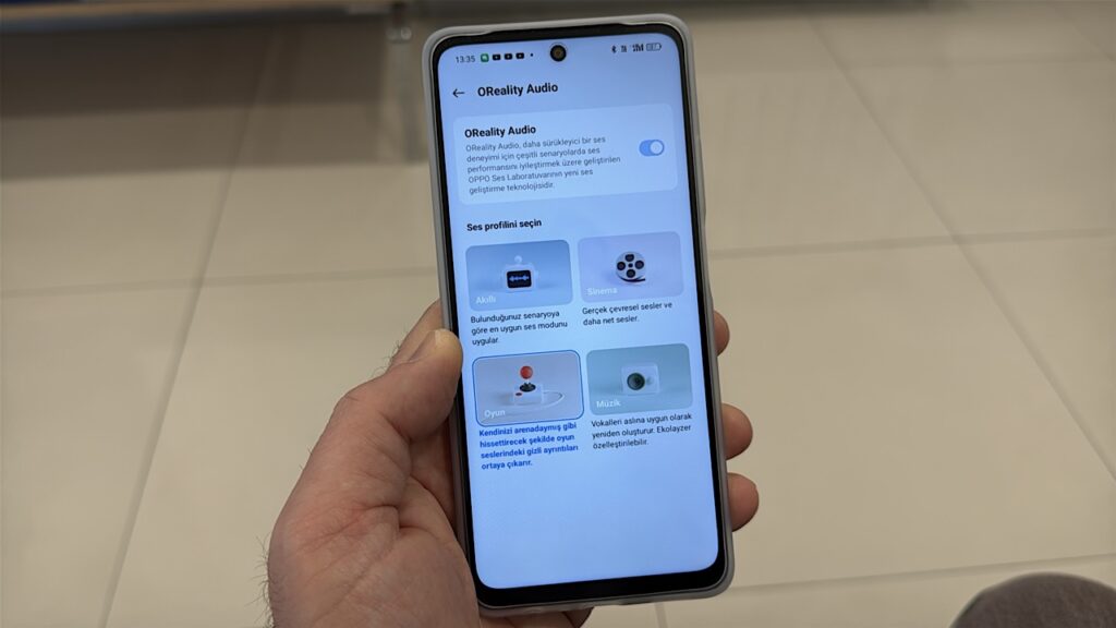 Ses performansı tarafında ise Oppo A3, segmentindeki rakiplerinden ayrılan birkaç özelliğe sahip. Ultra Ses Modu, hoparlörün ses seviyesini %300’e kadar artırabiliyor. Bu da, özellikle medya oynatımı sırasında kullanıcı deneyimini üst seviyeye taşıyor. Örneğin, bir pazar yerinde ya da yoğun trafik ortamında bile seslerin net bir şekilde duyulması mümkün oluyor. Aynı zamanda OReality Audio olarak adlandırılan özel bir mod, hoparlör üzerinden ses çıkışı aktif durumdayken kullanılıyor. Akıllı, Sinema, Oyun veya Müzik olarak belirlenmiş ses senaryolarından bir tanesini seçebilirsiniz. Hoparlörün genel ses kalitesi tatmin edici düzeyde ve özellikle açık alan kullanımlarında avantaj sağlıyor. Alt kenarda tek bir hoparlör bulunmasına rağmen, sesin dolgunluğu ve ses şiddeti gayet yeterli. Üstelik en yüksek ses seviyesinde tiz rahatsız etmiyor, herhangi bir patlama yaşanmıyor.